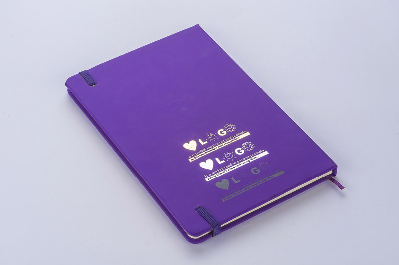 Gustowny notes A5 z kolorową gumką wykonany z materiału skóropodobnego (PU). Notes zawiera 80 kartek ecru w linie koloru pomarańczowego. Logo nadrukujemy na okładce.