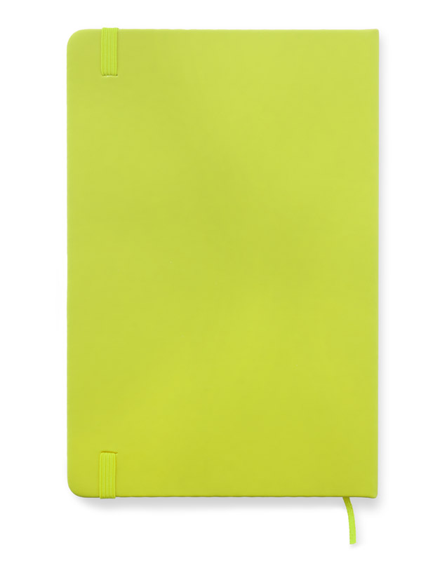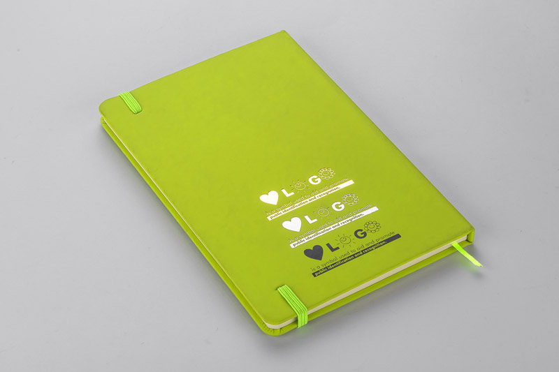 Gustowny notes A5 z kolorową gumką wykonany z materiału skóropodobnego (PU). Notes zawiera 80 kartek ecru w linie koloru pomarańczowego. Logo nadrukujemy na okładce.