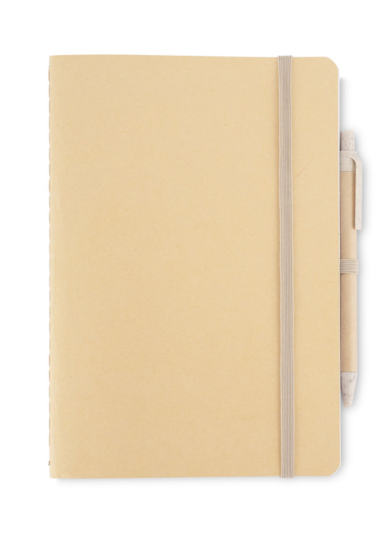 Notes REMATT w ekologicznej okładce wykonanej z recyklingowanego papieru w klasycznym brązowym kolorze. Do notesu dołączony jest długopis z niebieskim wkładem, którego korpus wykonany jest z recyklingowanego papieru, z wykończeniami z tworzywa ze słomy pszennej. Notes zamykany za pomocą gumki. Format A5.