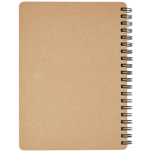 Notatnik z 60 kartkami w linię formatu A6 i długopisem do kompletu. Okładka i kartki wykonane z papieru makulatorowego. Notatnik i długopis pakowane razem.