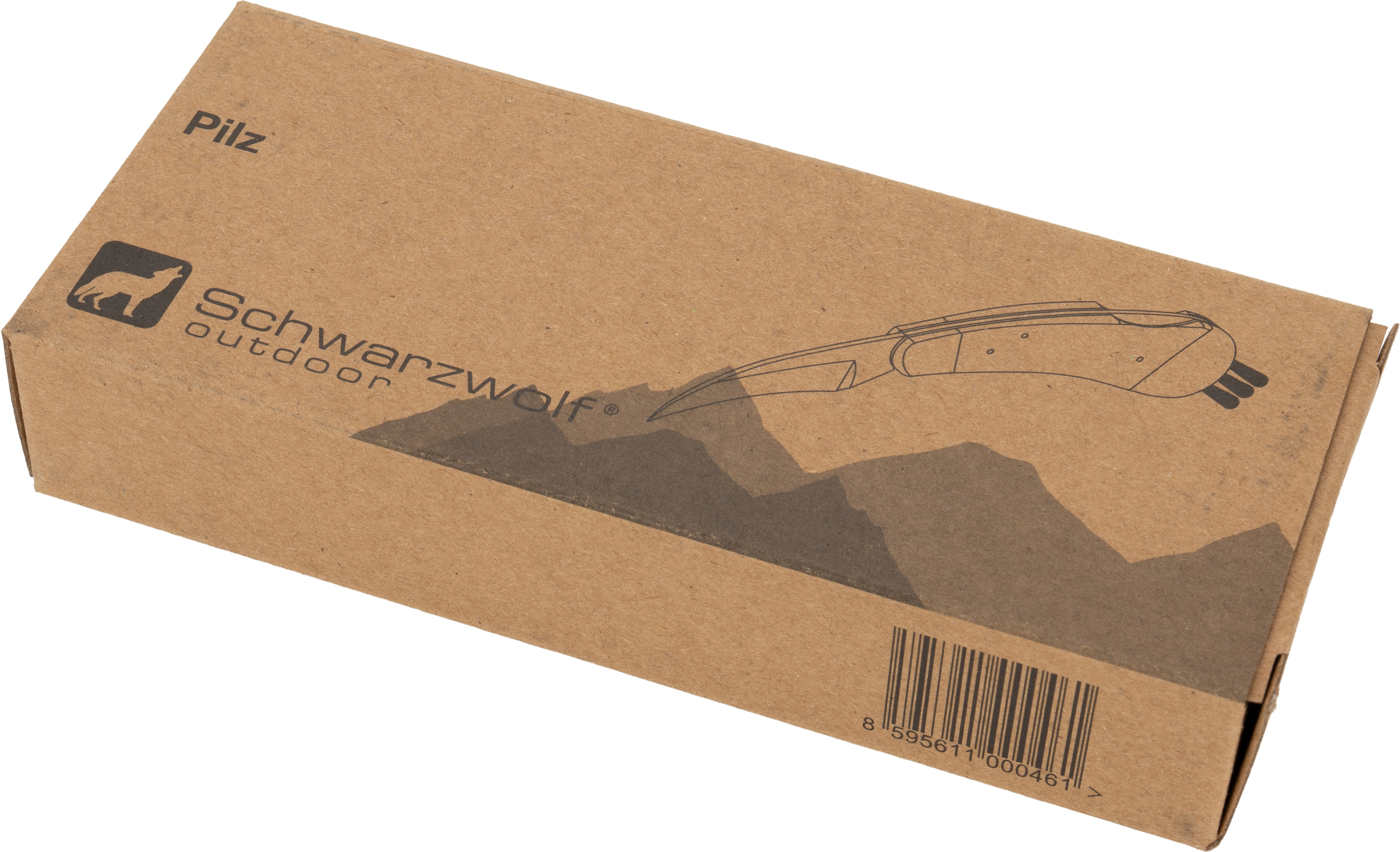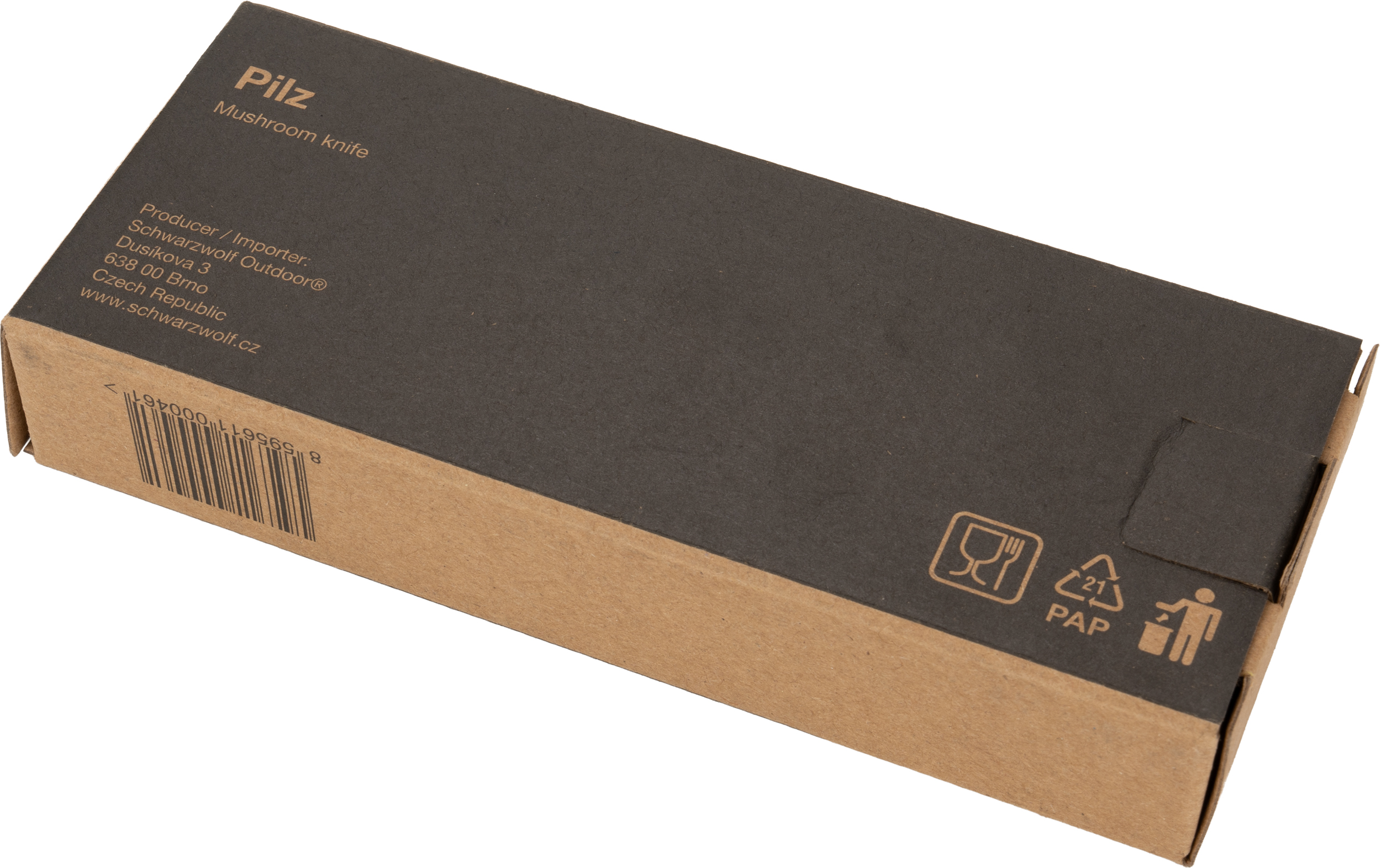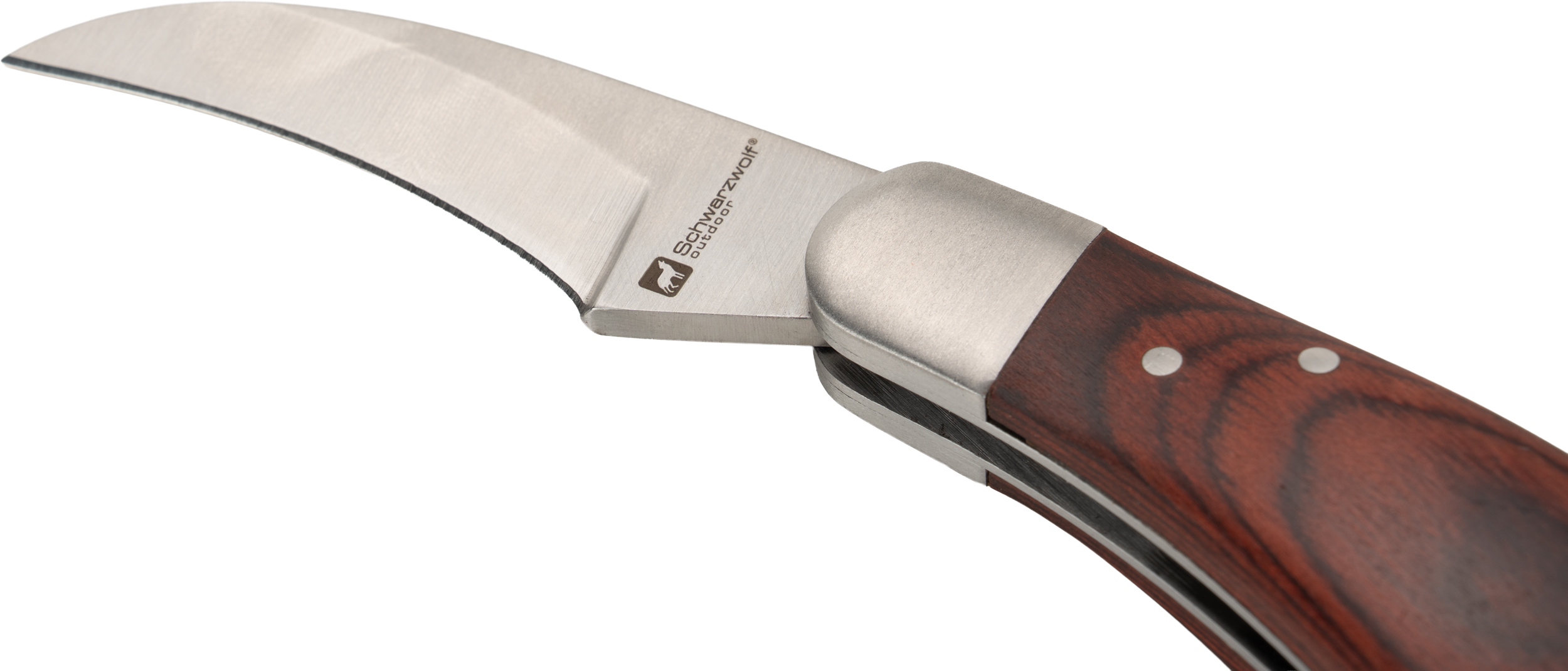 Nóż do zbierania grzybów, wykonany ze stali nierdzewnej i drewna, wyposażony w pędzelek do czyszczenia grzybów.