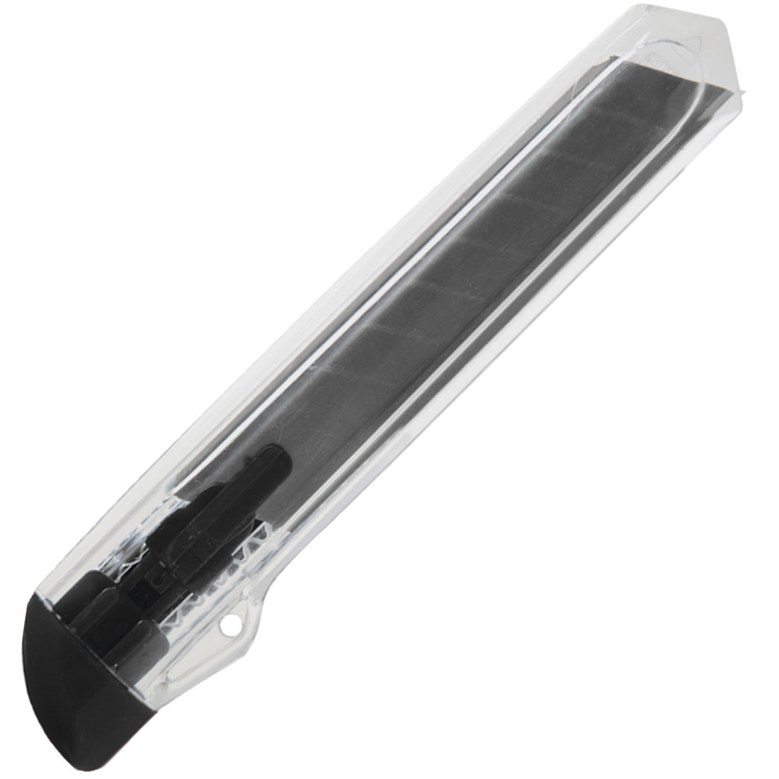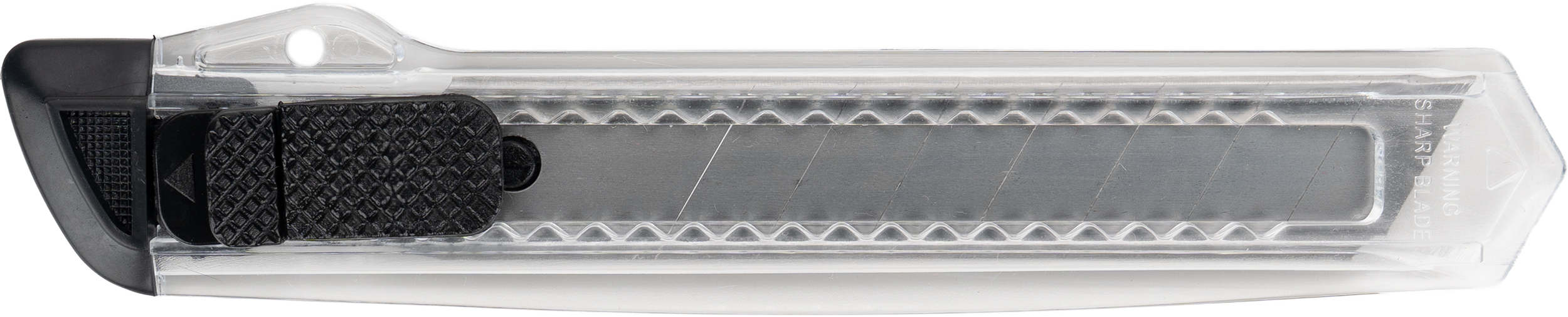 Transparentny nóż do kartonu z kolorową końcówką i łamanym ostrzem, w plastikowej obudowie.