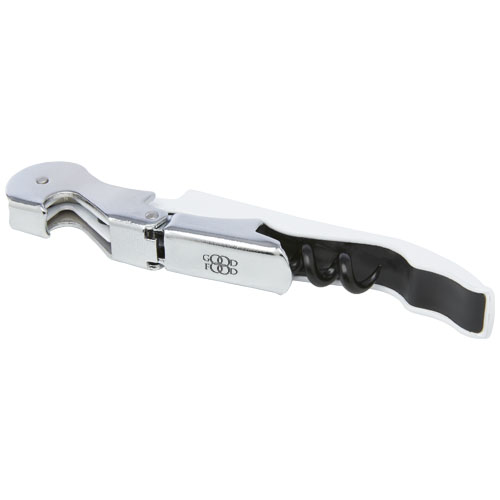 Nóż kelnerski ze stali nierdzewnej z kolorowym korpusem, wyposażony w korkociąg, przecinak do folii i otwieracz do butelek. Dzięki dwustopniowej konstrukcji można łatwo wyjąć korek z butelki.