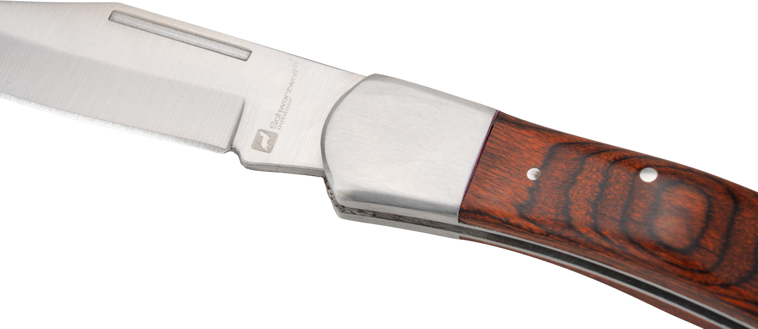 Składany nóż wykonany ze stali nierdzewnej, z drewnianą rękojeścią i blokadą bezpieczeństwa.