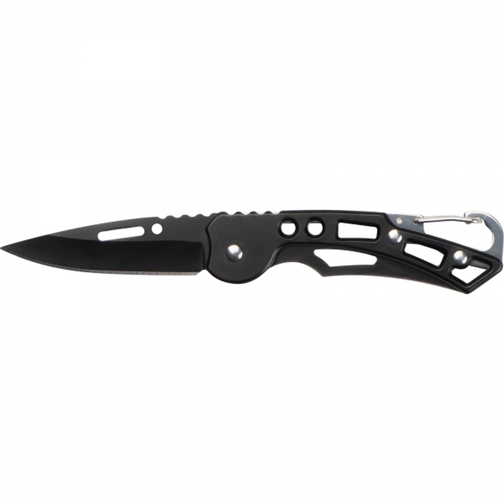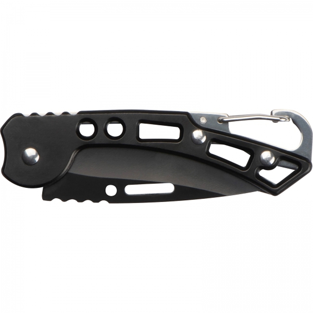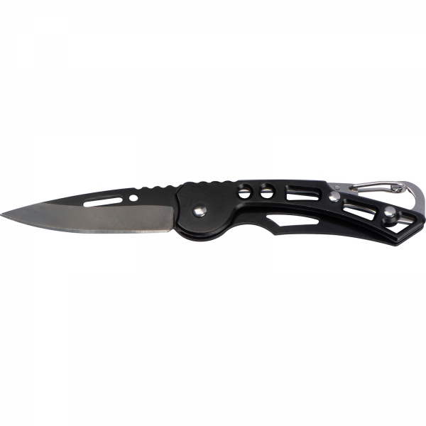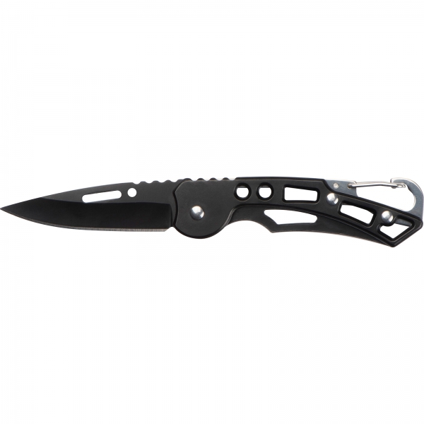 Składany nóż z blokadą ostrza, ergonomiczną strefą chwytu i karabińczykiem ułatwiającym mocowanie.