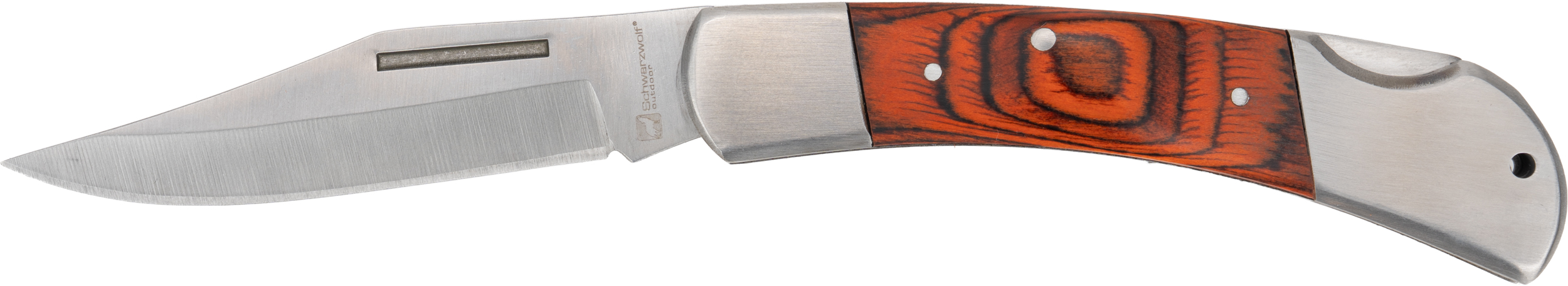 Składany nóż wykonany ze stali nierdzewnej, z drewnianą rękojeścią i blokadą bezpieczeństwa.