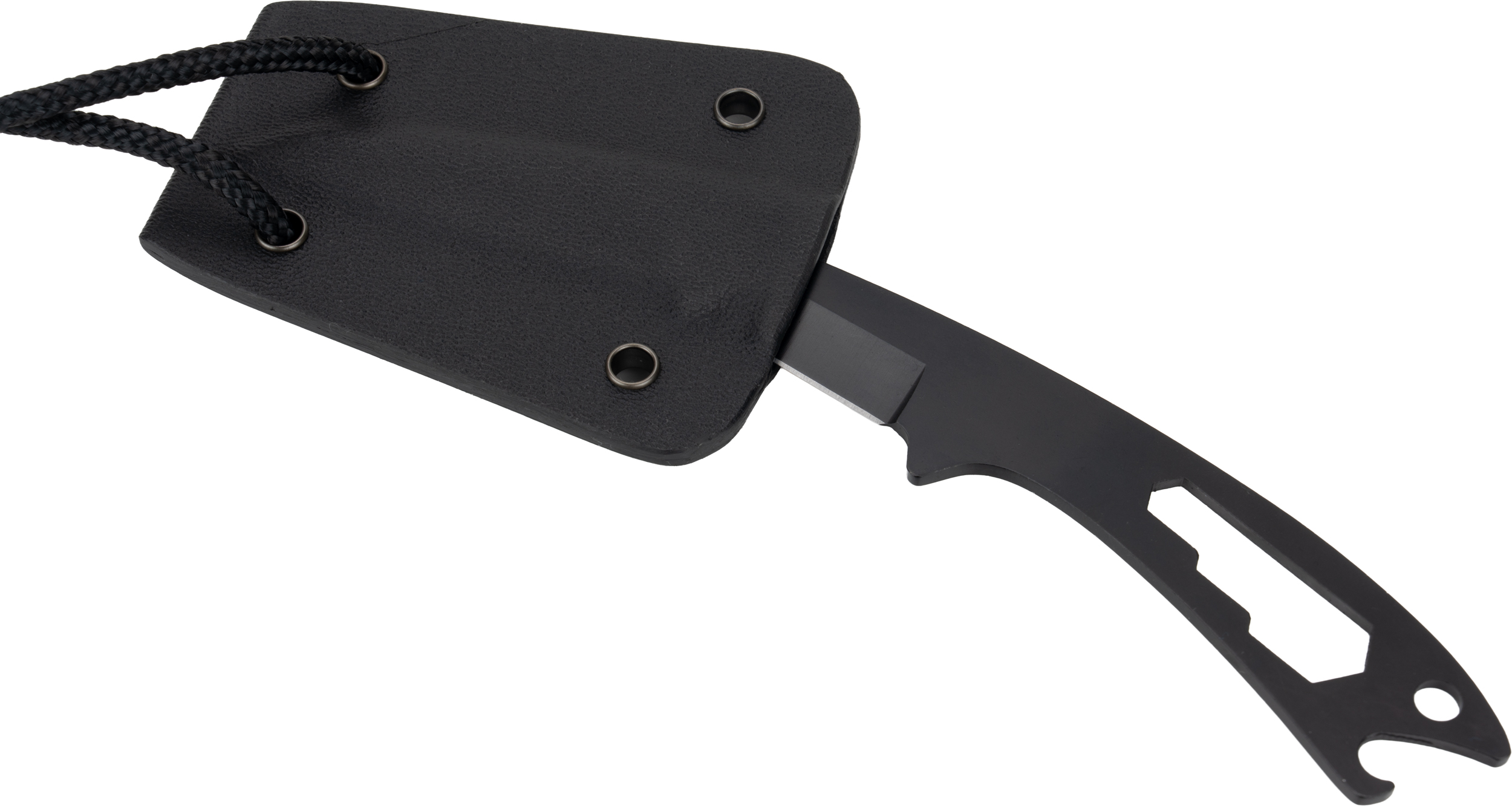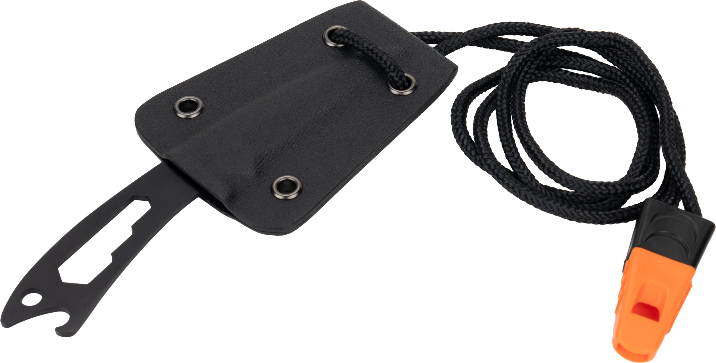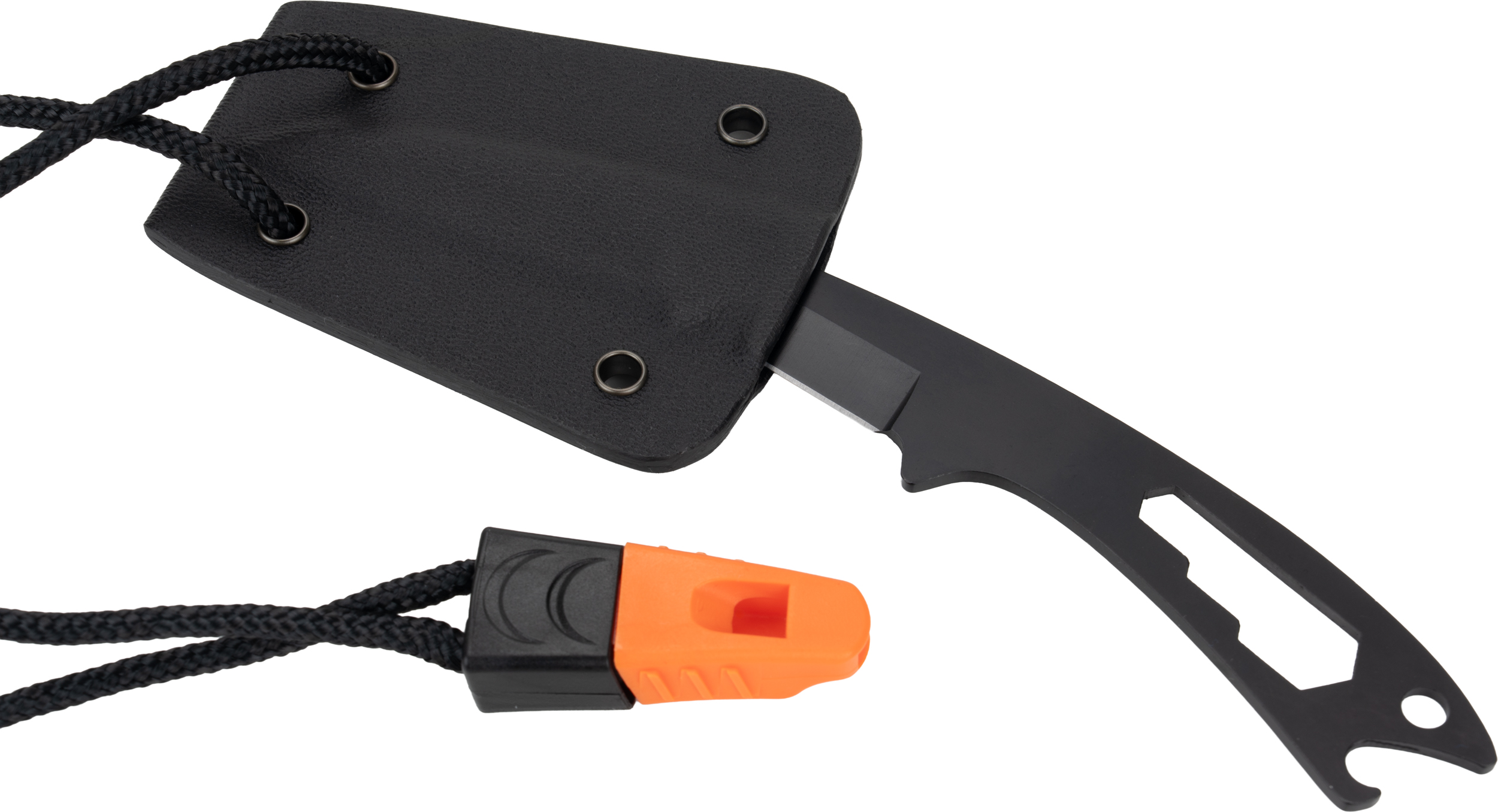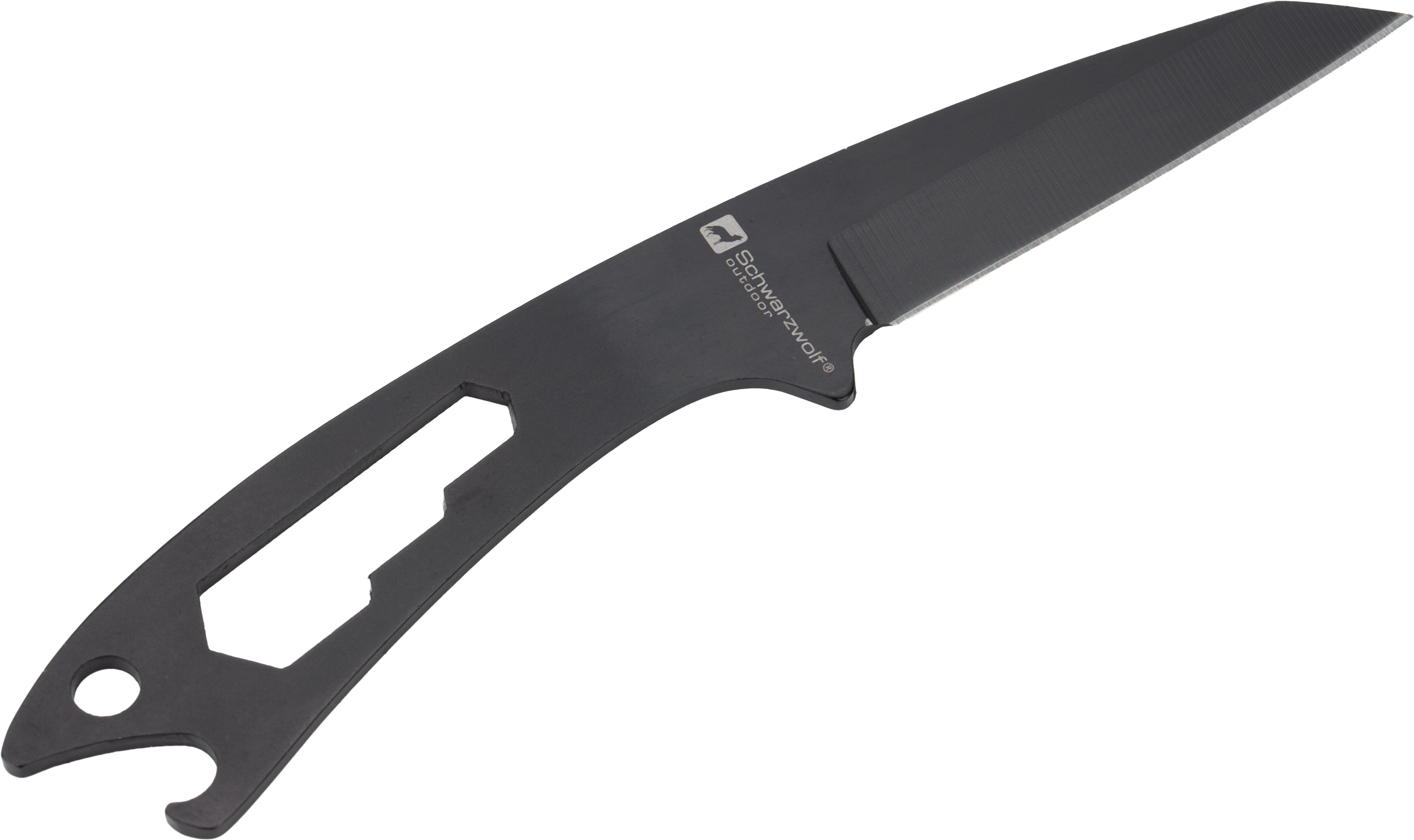 Wielofunkcyjny nóż Schwarzwolf w etui ze ściągaczem. Dzięki końcówce do dokręcania nakrętek umieszczonej przy rękojeści nóż może służyć jako otwieracz do butelek. Nóż zawiera również pomarańczowy gwizdek na sznurku. Obudowa wykonana jest ze specjalnego stopu tworzywa Kydex. Materiał: stal nierdzewna, Kydex.