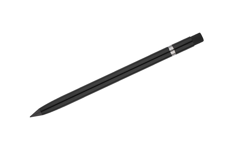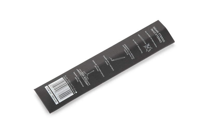 ETERNO to nowy typ ołówka, który zawsze będzie zatemperowany i nigdy się nie wypisze. Tradycyjny grafit został tu zastąpiony specjalnym utwardzonym rysikiem, który daje komfort pisania podobny do świeżo zatemperowanego ołówka. Korpus wykonany z aluminium zapewnia trwałość na lata. Na górze umieszczona gumka do mazania, która bez problemu zetrze notatki wykonane ołówkiem ETERNO (możliwość użycia także innych standardowych gumek). Ołówek wpisuje się w trend eko pozwalający zminimalizować ilość odpadów oraz surowców zużytych do produkcji przedmiotów codziennego użytku. Pakowany w czarne papierowe etui z infografiką z tyłu.