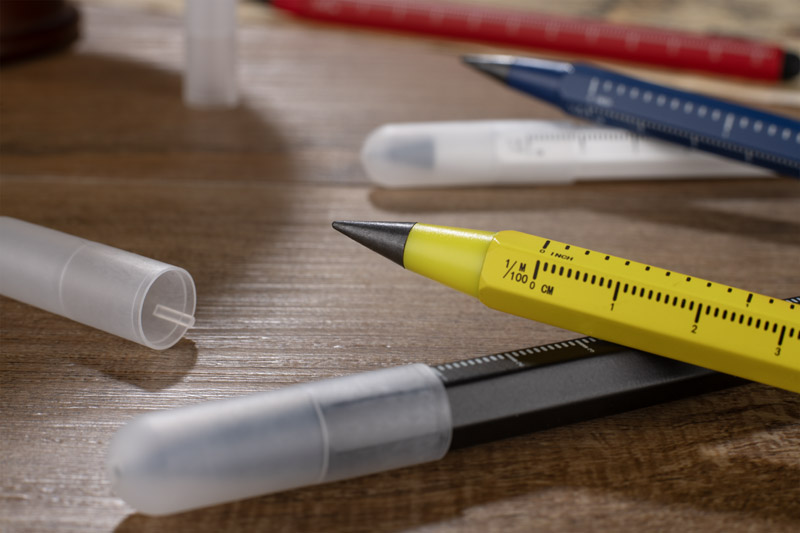 Ołówek wieczny DRAWI to praktyczny gadżet reklamowy wykonany z recyklingowanego aluminium z lakierowanym wykończeniem. Wyposażony w miarkę o długości 11 cm z podziałką w centymetrach i calach oraz touch pen, sprawdzi się w biurze, branży technicznej i budowlanej. Sześciokątny korpus zapewnia wygodny chwyt i zapobiega staczaniu się ołówka ze stołu. Zatyczka z tworzywa chroni końcówkę, co podnosi komfort użytkowania. Kompaktowy format sprawia, że DRAWI jest zawsze pod ręką i stanowi solidny nośnik reklamy dzięki możliwości znakowania.