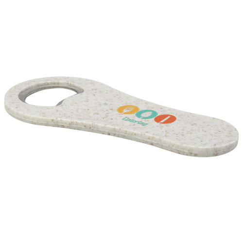Otwieracz do butelek wykonany ze słomy pszenicznej do otwierania butelek z piwem, napojami bezalkoholowymi itp. Słoma pszeniczna jest pozostałością łodyg po zbiorze ziaren pszenicy, co zmniejsza ilość zużywanego plastiku.