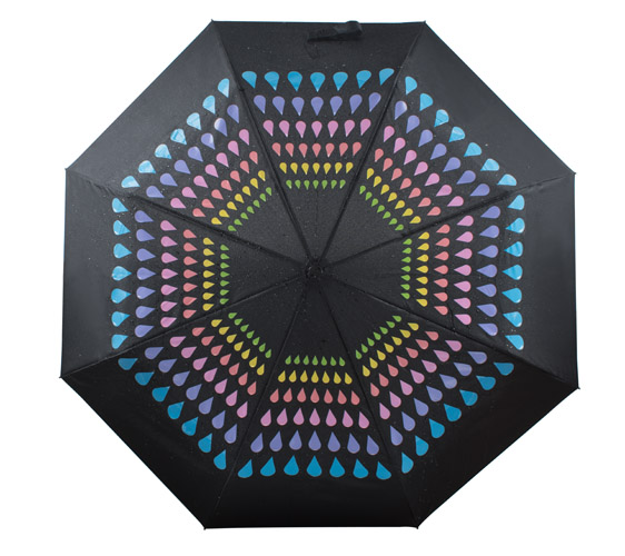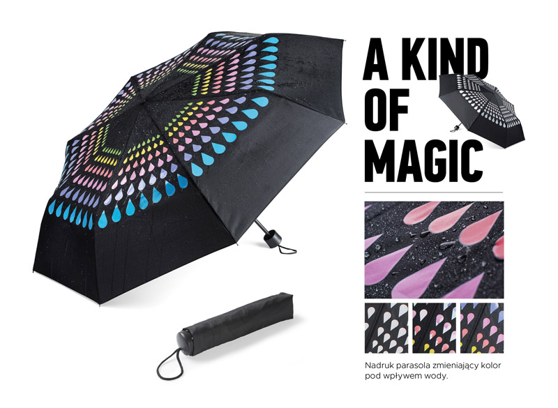 Składany parasol manualny CROPLA to bardzo efektowny gadżet. Posiada zaprojektowany przez grafików Blue Collection nadruk zmieniający kolor pod wpływem wody. Parasol ma metalowy stelaż i jest wykonany z poliestru pongee 190T.