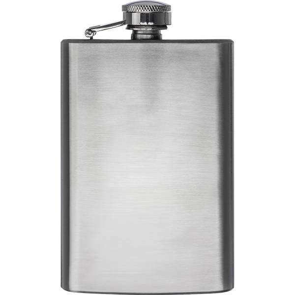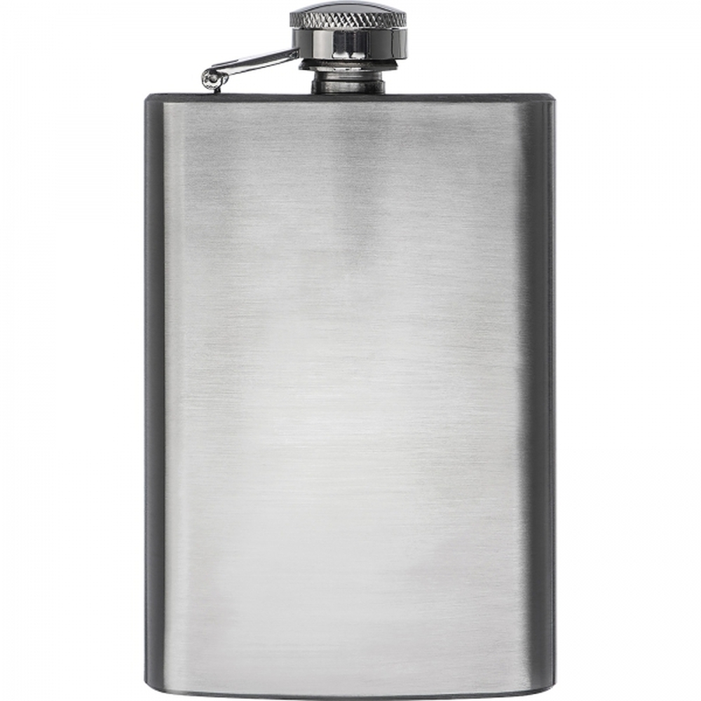 Mała piersiówka ze stali nierdzewnej z bezpiecznym zamknięciem, pojemność 104 ml.