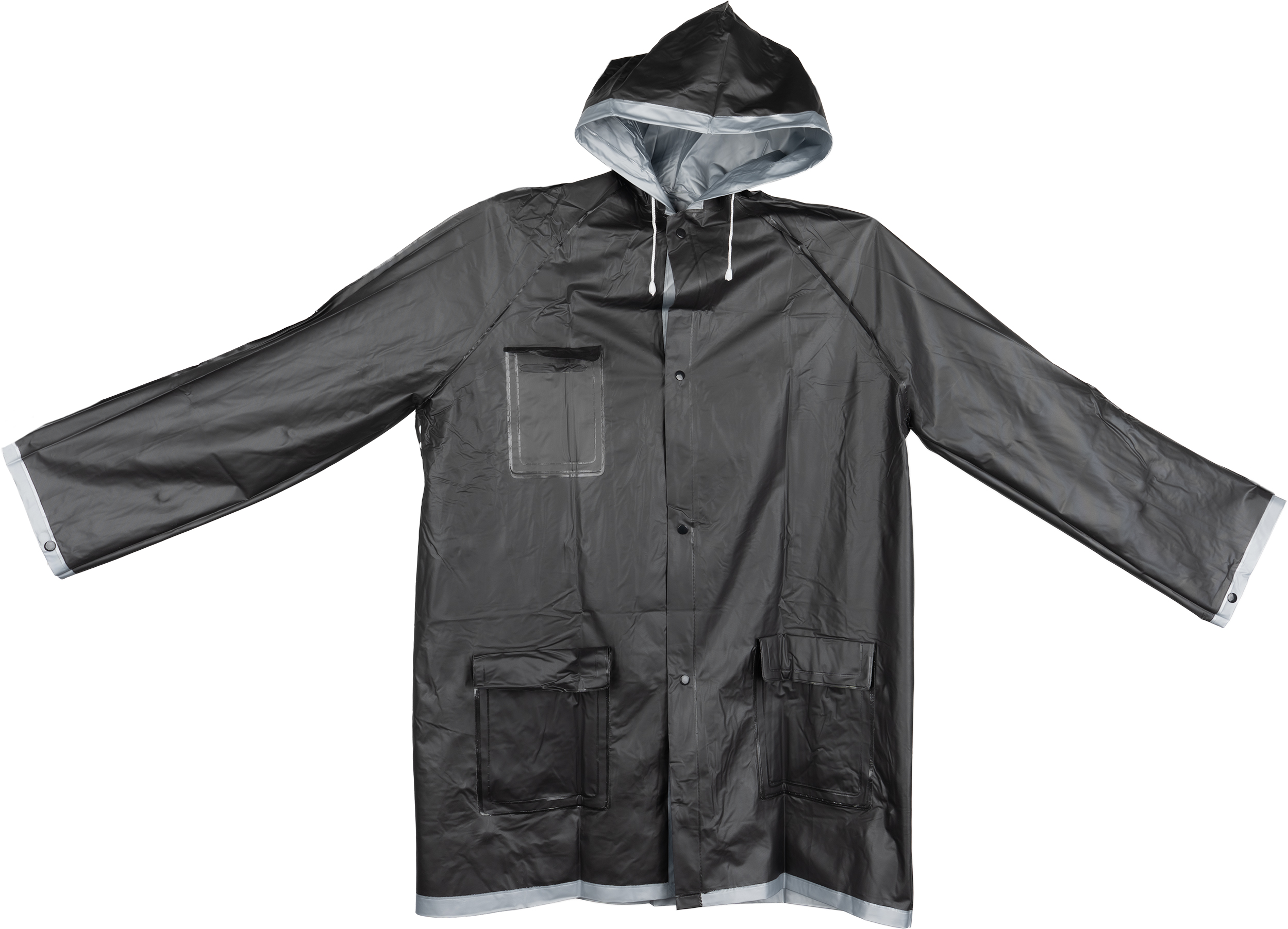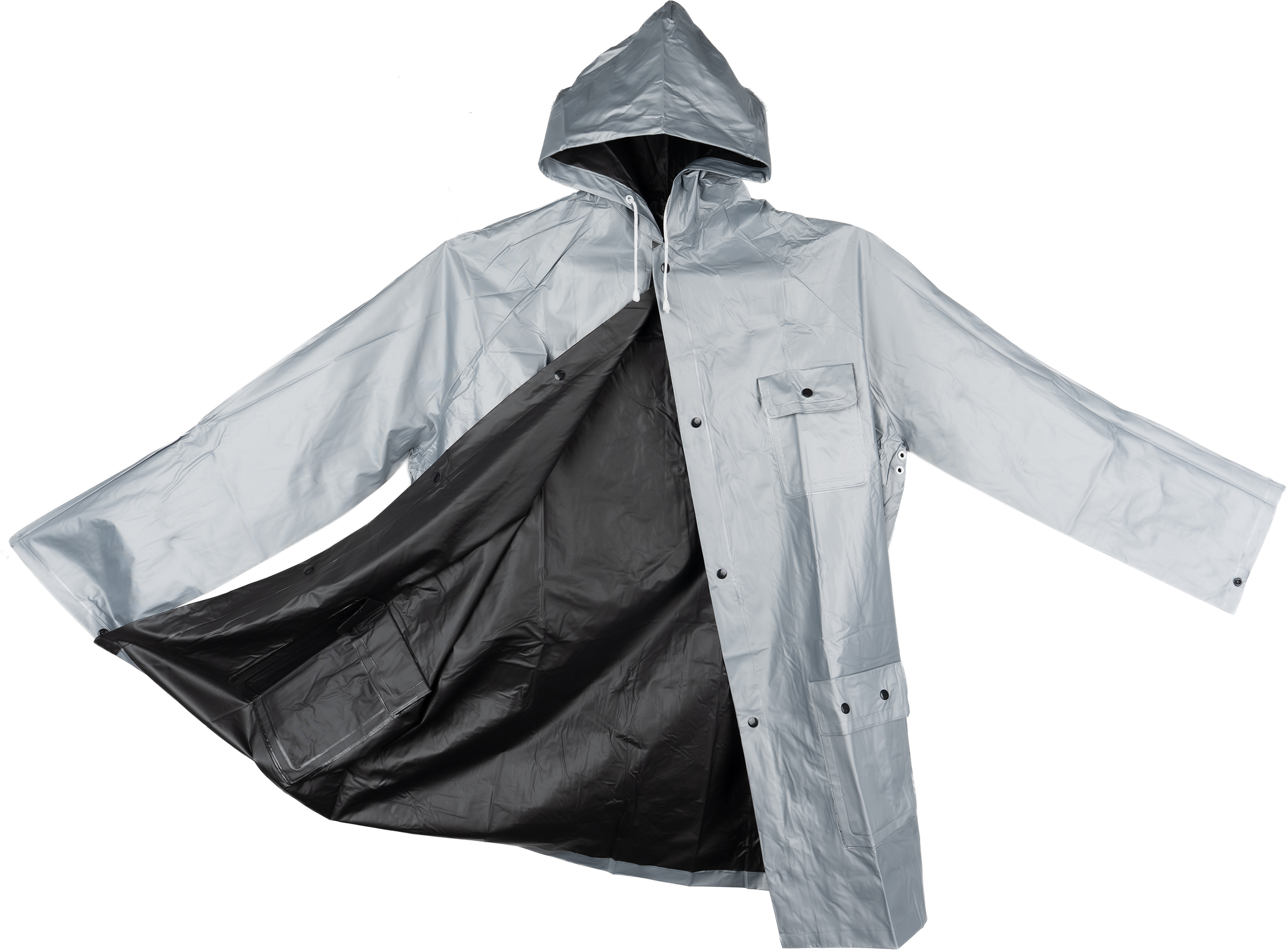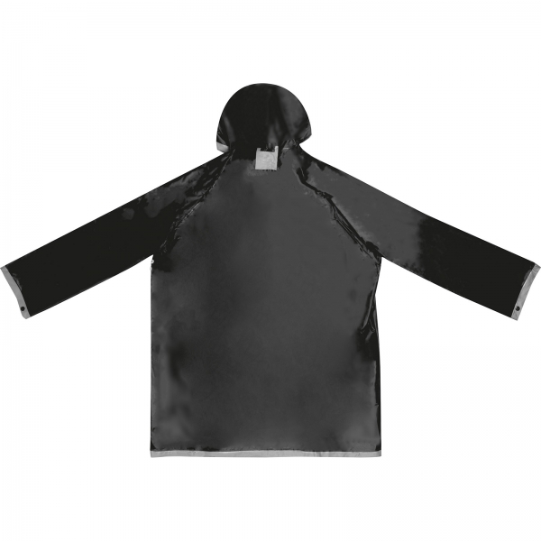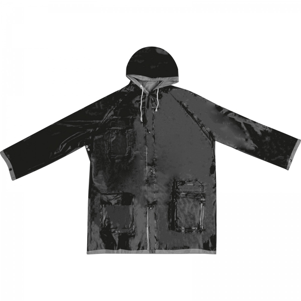 Dwukolorowa kurtka przeciwdeszczowa XL, z PVC (bez ftalanów), z zatrzaskami i kapturem. Wymiary pleców kurtki 103 x 60 cm.