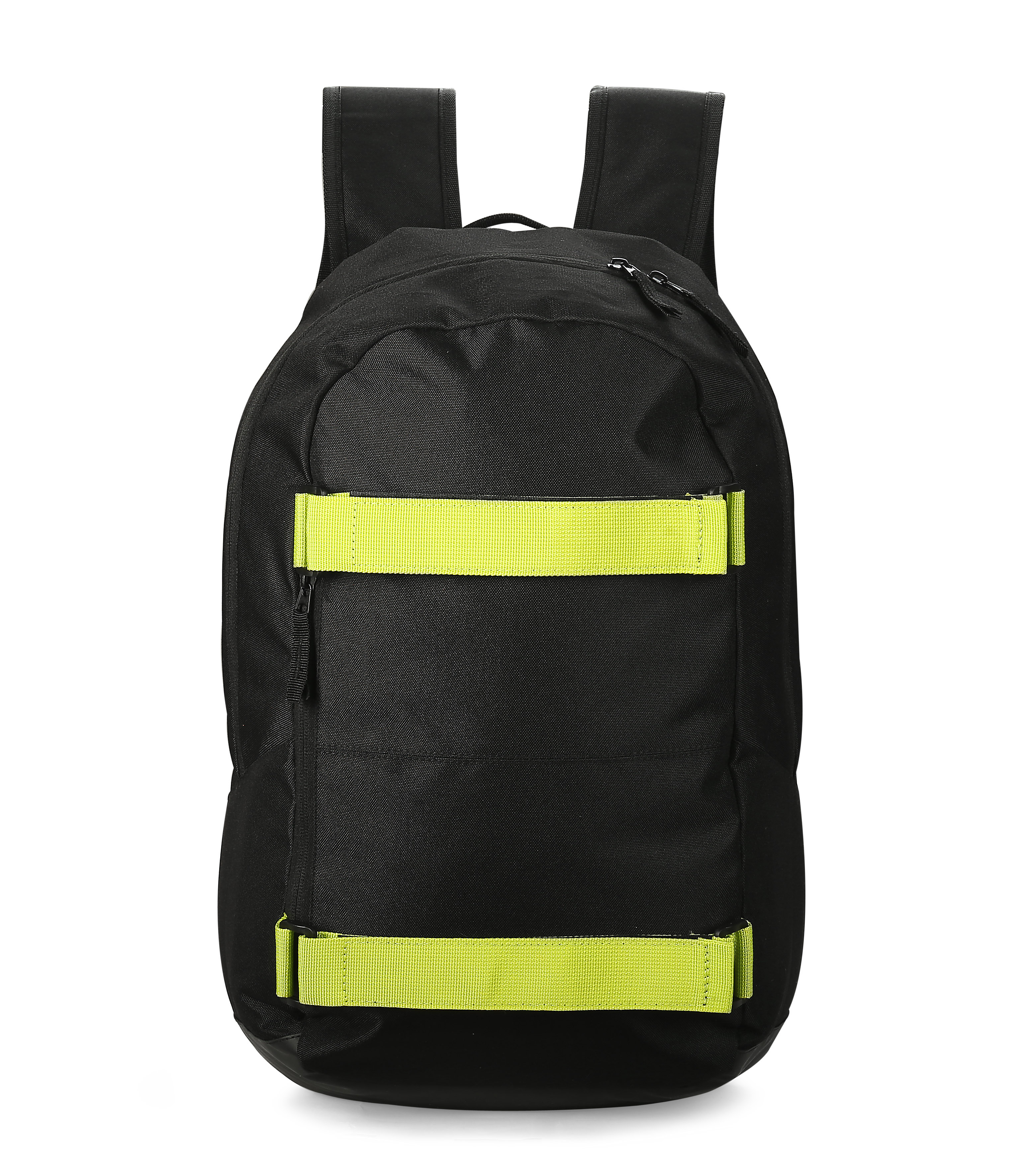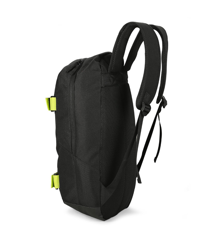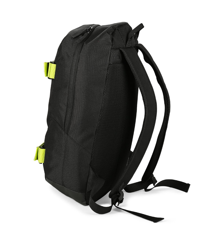 Plecak BOARD wykonany jest z poliestru 600D. Posiada jedną komorę główną zapinaną dwoma suwakami. W środku jest dodatkowa przegroda niezamykana zamkiem oraz siateczkowa kieszeń na kanapkę lub przekąskę zapinana na zamek. Ogromną zaletą plecaka są dwa paski w jaskrawym kolorze zapinane na rzep, które z powodzeniem utrzymają nawet deskorolkę. Plecak jest bardzo wygodny w noszeniu, od strony pleców jest wzmocniony gąbką i miękką siateczką oraz posiada nieprzemakalne dno z powłoką z PVC.