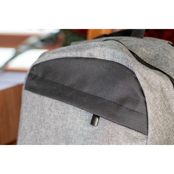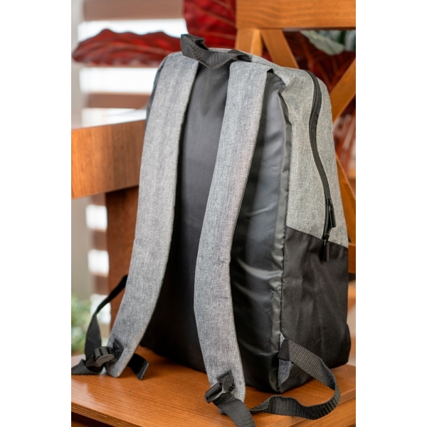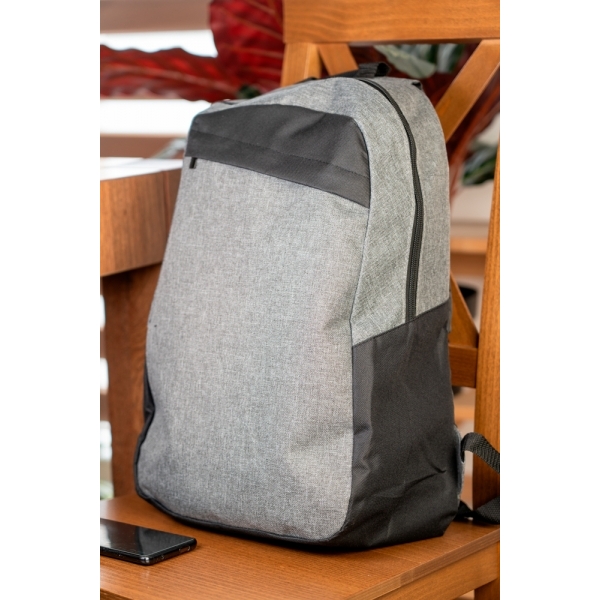 Plecak wykonany z poliestru 600D, z dużą przegrodą główną, mniejszą kieszonką z przodu. Plecak posiada watowane plecy i regulowane szelki.
