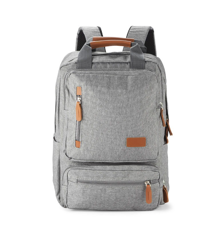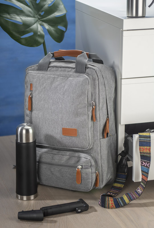 Jednokomorowy plecak PAKKU to odpowiedni wybór zarówno dla kobiet, jak i dla mężczyzn. Szarość czyni go uniwersalnym, a jasnobrązowe elementy z ekoskóry stanowią ciekawy kontrast. Dzięki pięciu kieszeniom wewnętrznym i sześciu zewnętrznym – czterem zapinanym na zamek i dwóm bocznym – PAKKU jest bardzo pojemny. Dodatkowo posiada dwie wzmocnione ekoskórą rączki ułatwiające trzymanie. Plecak jest wykonany z poliestru 600D.
