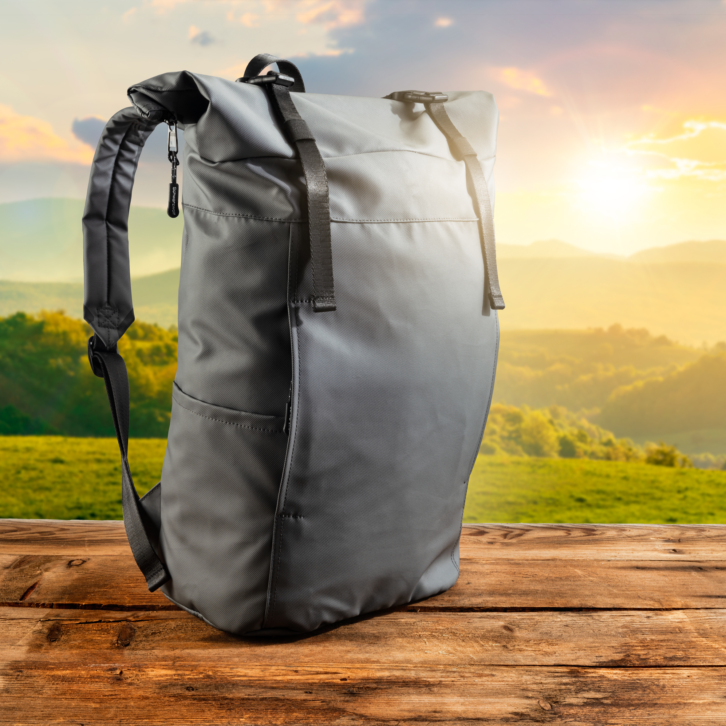 Praktyczny plecak z rolowanym zamknięciem. Plecak posiada dwie małe przednie kieszenie zapinane na zamek, dwie boczne kieszenie oraz zamykaną na zamek, dużą komorę główną, wewnątrz której znajdują się przegródki na drobne akcesoria. Po zrolowaniu, plecak zapinany jest na dwie plastikowe klamry. Plecak posiada watowane plecy i szelki. Pojemność: zwinięty - 25l; rozłożony 32 l.