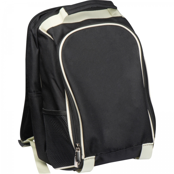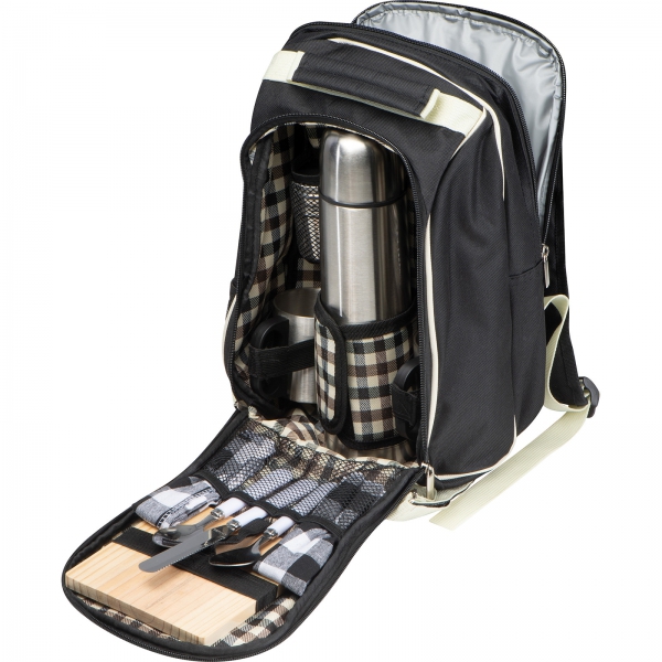 Plecak piknikowy z wytrzymałego poliestru z przegrodą chłodzącą. Zawiera wyposażenie dla 2 osób: termos ze stali nierdzewnej, dwa stalowe kubki, pojemniki na sól i pieprz, małą deskę, sztućce i serwetkę.