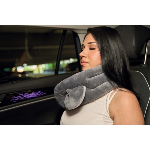 Przytulna poduszka na szyję wykonana z aksamitnego weluru. Pasek zapięcia umożliwia łatwe zabezpieczenie poduszki po zwinięciu.