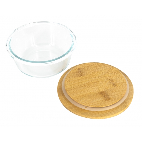 Szklana miska o pojemności 300 ml wykonana ze szkła, posiada zamknięcie w postaci bambusowej pokrywki.