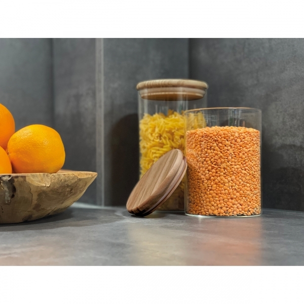 Szklany słoik o pojemności 700 ml, wyposażony w bambusowe wieczko z silikonową uszczelką. Świetnie sprawdzi się w kuchni.