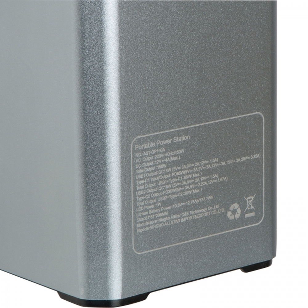 Power bank wykonany z aluminium, o pojemności 39 000 mAh. Moc wyjściowa max. 150W, wejście i wyjście USB oraz typ C. Dane techniczne: DC-OUT (5521) Output: 12V 4.0A (Max.) Type-C1 Input/Output: PD65W USB1 Output: QC18W Type-C2 Output: PD20W USB2 Output: QC18W USB1+Type-C1 Total Output: 65W (Max.) USB2+Type-C2 Total Output: 20W (Max.) AC Output: 220V/50Hz, 150W (Max.) LED Torch: 1W Pojemność: 10.8V/12.75Ah/137,7Wh (38250 mAh). Inne: Produkt zapakowany w solidny karton, zabezpieczony pianką wewnątrz. Zestaw zawiera wtyczkę z typem złącza C. Input: 100-240VAC, 50-60Hz, 1A, Output USB-C: PD 3.0 (max. 20W) 5V/3A (max. 15W), 9V/2A (max. 18W), 12V/1.67A (max. 20W) oraz kabel wyposażony w podwójne złącze typu C