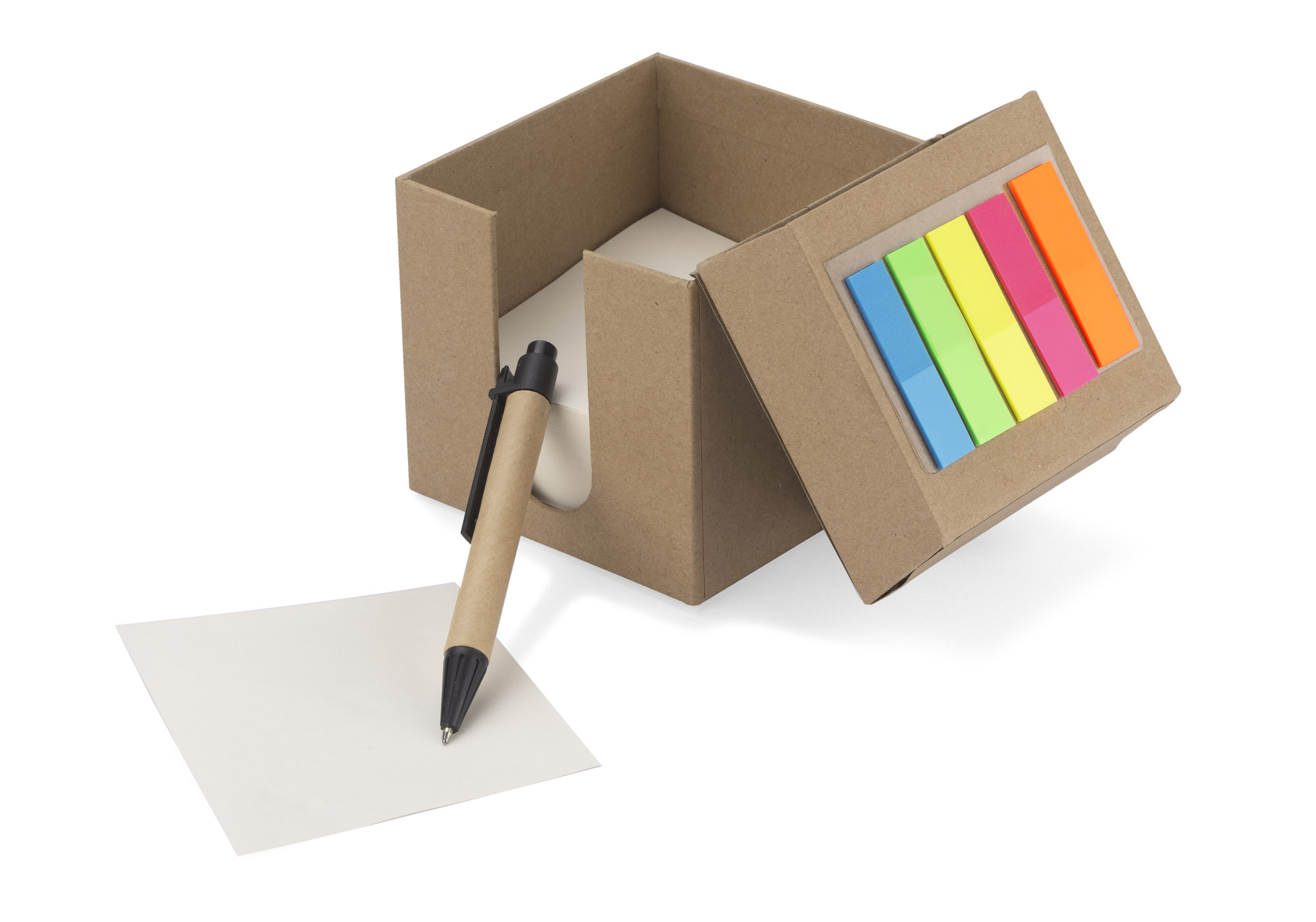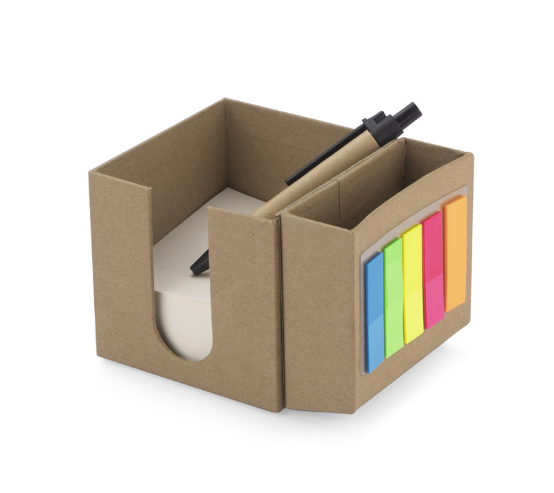 Oryginalny zestaw karteczek w tekturowej kostce - zestaw ten można rozłożyć do formy wygodnego stojaka na biurko. W środku znajduje się zestaw białych karteczek biurowych, pojemnik na artykuły piśmiennicze oraz kolorowe zakładki samoprzylepne z tworzywa PET. Tworzywo PET użyte do produkcji zakładek sprawia, że znacznie lepiej kleją się do kartek i są trwalsze w porównaniu do zakładek papierowych. Jeżeli szukasz funkcjonalnego produktu, który jednocześnie jest ekologiczny to jest to idealny wybór. W zestawie długopis. Znakowanie jest możliwe na opakowaniu.