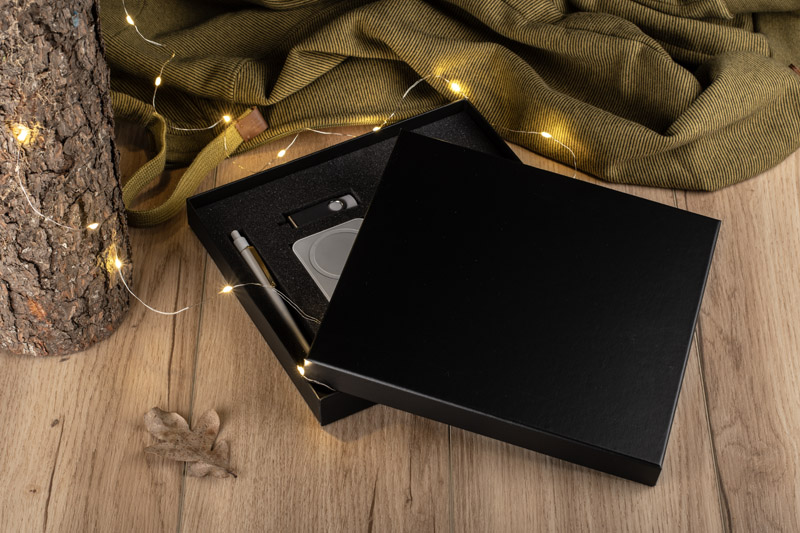 Czarne pudełko wykonane z mocnego, solidnego materiału, matowe dla lepszego efektu. Wewnątrz wyłożone jest pianką, którą można dostosować pod wybrane produkty. Możliwość stworzenia własnego zestawu.Pudełko sprzedawane jest bez wyposażenia. Wyprodukowano w Polsce.