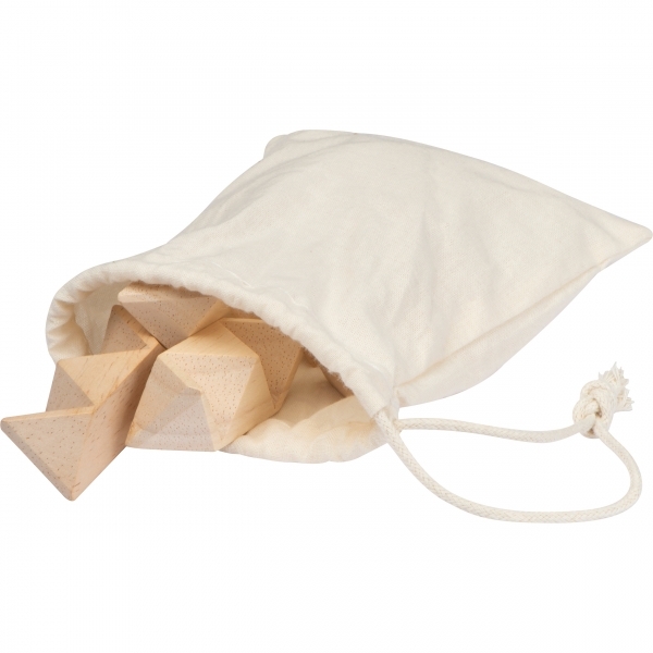 Drewniane puzzle 3D w kształcie gwiazdy. Całość zapakowana w woreczek.