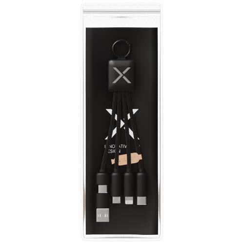 Kabel do ładowania 5 w 1 z 3 złączami (typu C, Android, iPhone) i przewodami z tworzywa sztucznego rPET (wykonanymi z plastikowych butelek pochodzących z recyklingu). Dzięki podwójnemu wejściu USB-A + USB-C, kabel jest w 100% kompatybilny z najnowszymi komputerami na rynku (USB-C). Metaliczne wykończenie zaślepek. Kabel może ładować do 3 urządzeń jednocześnie. Dostarczany w nadającym się do recyklingu etui i karcie z papieru z recyklingu.