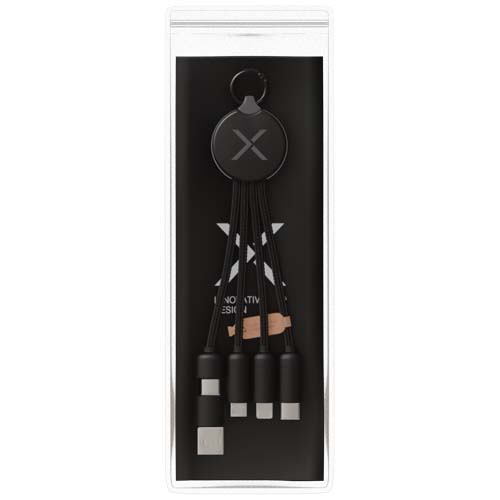Kabel do ładowania 5 w 1 z 3 złączami (typu C, Android, iPhone) i przewodami z tworzywa sztucznego rPET (wykonanymi z plastikowych butelek pochodzących z recyklingu). Dzięki podwójnemu wejściu USB-A + USB-C, kabel jest w 100% kompatybilny z najnowszymi komputerami na rynku (USB-C). Metaliczne wykończenie zaślepek. Kabel może ładować do 3 urządzeń jednocześnie. Dostarczany w nadającym się do recyklingu etui i karcie z papieru z recyklingu.