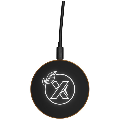 Bezprzewodowa stacja ładująca o mocy 10 W wykonana z gumy i drewna z certyfikatem FSC, z kablem ładującym wykonanym z plastiku z recyclingu. Może być ozdobiona podświetlanym logo. Dostarczana w czarnym pudełku upominkowym typu kraft z magnetycznym zamknięciem. Patent EUROPE EUIPO.