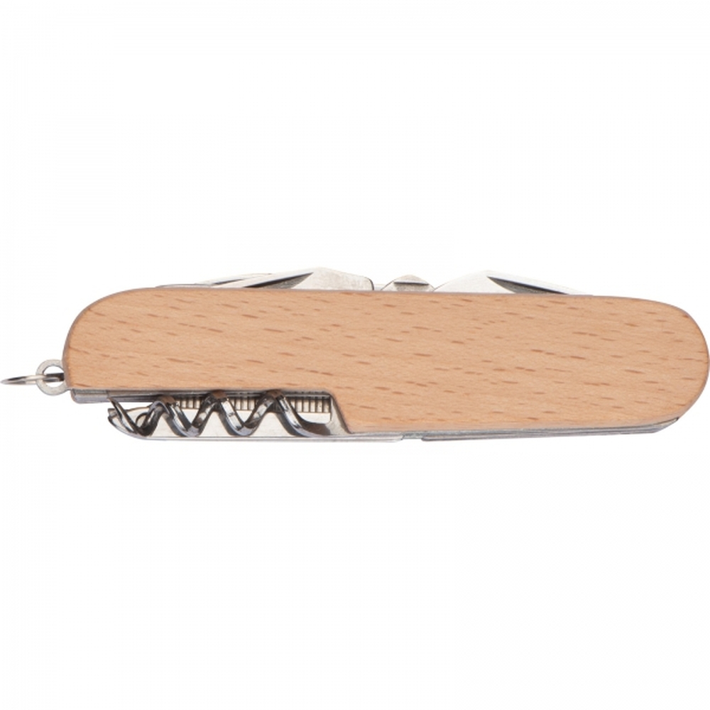 Scyzoryk z 11 funkcjami to niezawodne narzędzie wykonane z trwałej stali nierdzewnej, osadzone w eleganckiej, drewnianej obudowie, która łączy naturalny urok z wytrzymałością. Wyposażony w dwie piły do precyzyjnego cięcia drewna i innych materiałów, praktyczne nożyczki, otwieracz do butelek i puszek oraz korkociąg, idealny na każdą okazję towarzyską. Dodatkowo tarnik i śrubokręt umożliwiają szybkie naprawy i regulacje w terenie. Kompaktowy i lekki, łatwo mieści się w kieszeni czy plecaku, będąc nieocenionym wsparciem dla turystów, majsterkowiczów i osób ceniących gotowość na różnorodne wyzwania.