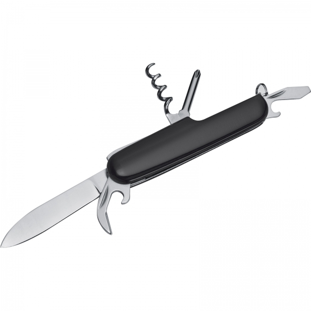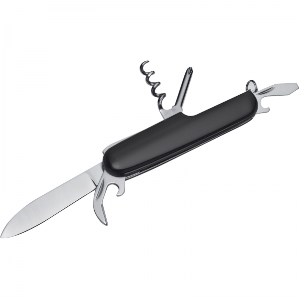 Scyzoryk z aluminium i stali nierdzewnej, posiadający 7 funkcji: nożyk, otwieracz do puszek i butelek, korkociąg, śrubokręt oraz brelok.