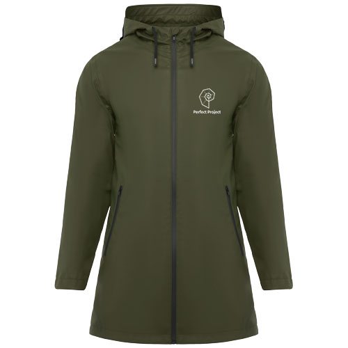 Wodoodporna kurtka przeciwdeszczowa dla kobiet. Kaptur z daszkiem. Zgrzewane zamki i szwy. Kontrastowe detale w kolorze czarnym. Dwie boczne kieszenie zapinane na zamek. Rozcięcie z tyłu. Usuwalna metka. Wodoodporna.