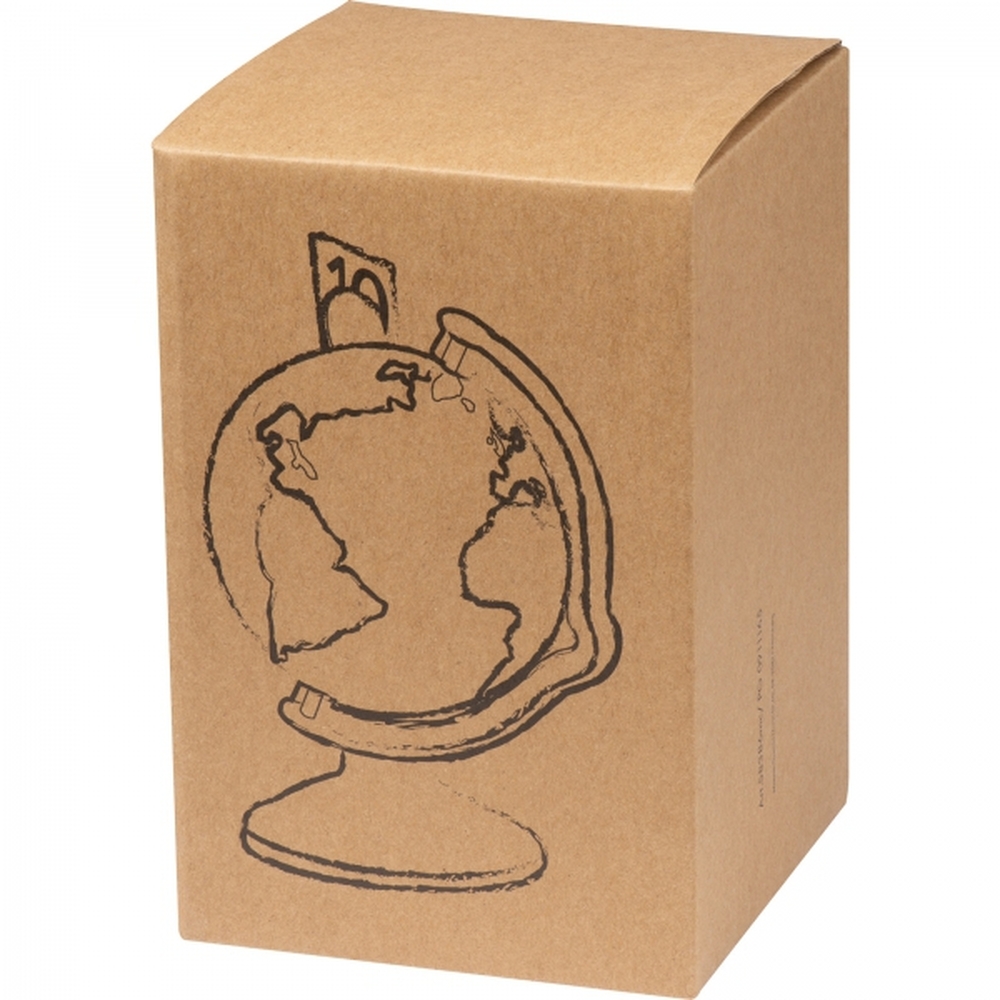 Obracająca się skarbonka w kształcie kuli ziemskiej wykonana z plastiku.
