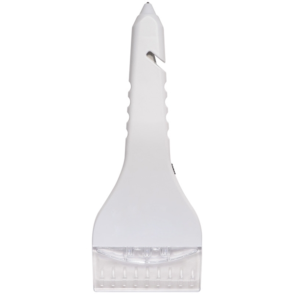 Samochodowa skrobaczka do szyb z trzema ledami, przecinarką i młotkiem. Materiały użyte do produkcji: ABS, PS, stal. Produkt zawiera 4 baterie coin cell.