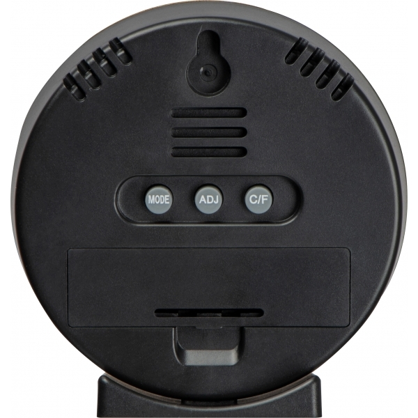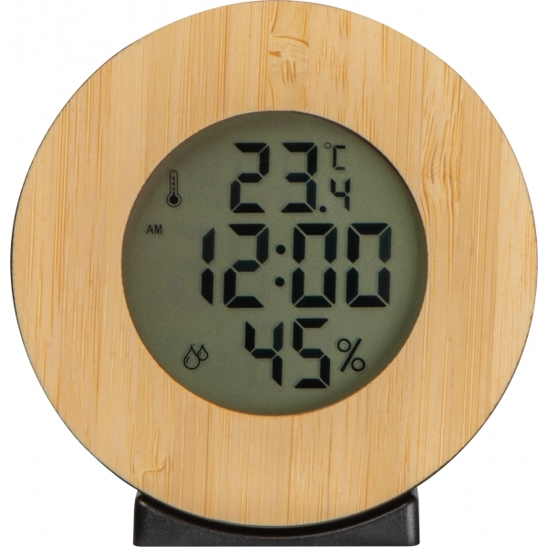 Stacja pogodowa z cyfrowym wyświetlaczem wskazującym godzinę, temperaturę oraz wilgotność powietrza.