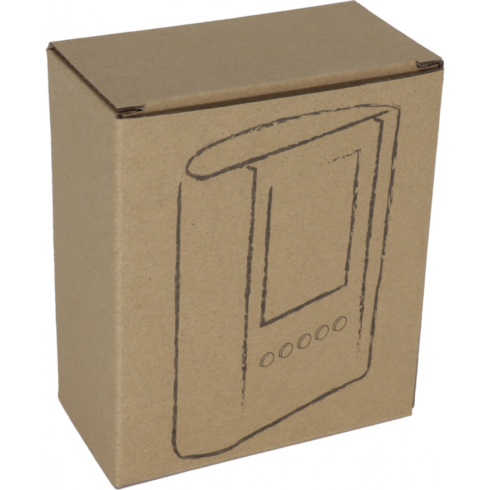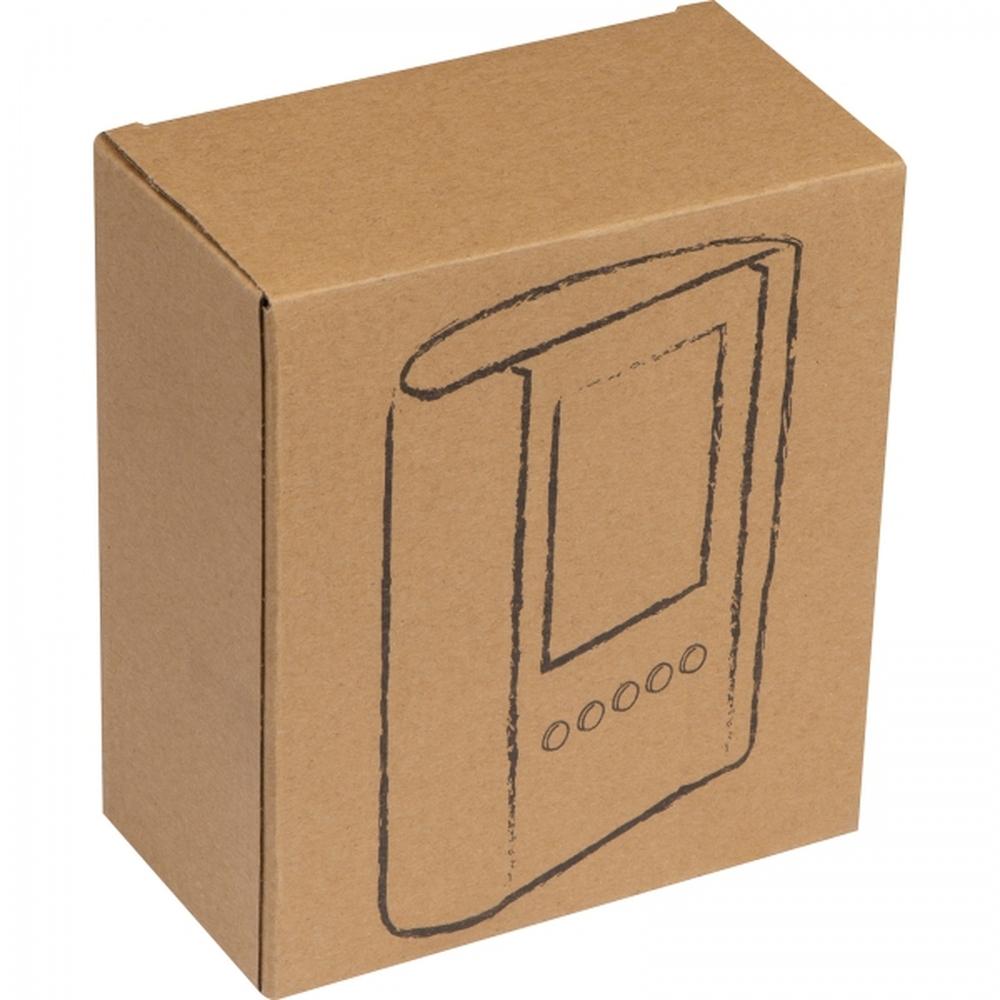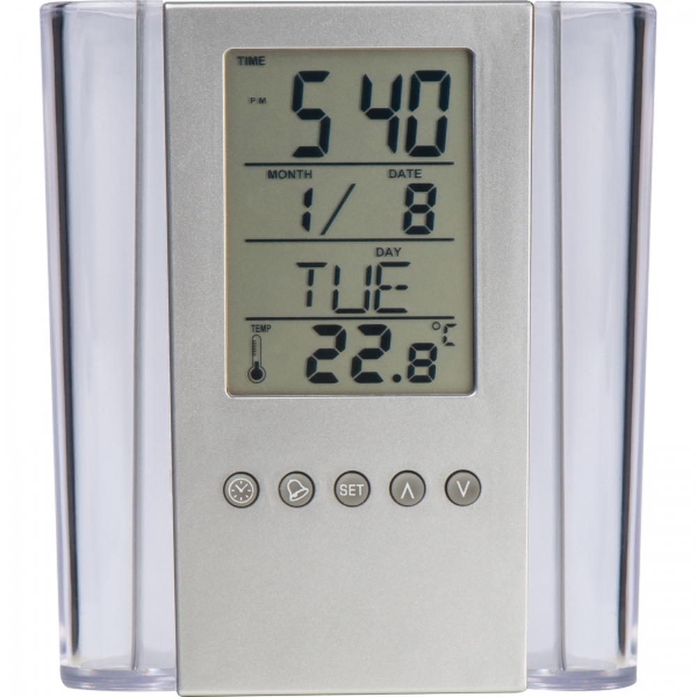 Praktyczny stojak biurkowy wykonany z akrylu, z zegarem, alarmem, termometrem i kalendarzem. Logotyp można umieścić na powierzchni pod klawiszami funkcyjnymi. Produkt zawiera baterie.