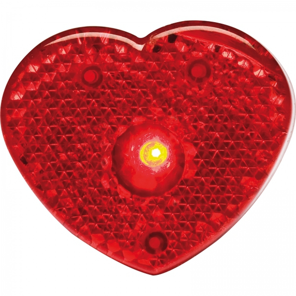 Plastikowe światełko LED w kształcie serca, z klipsem i kółkiem do zaczepiania. Produkt zawiera baterie.
