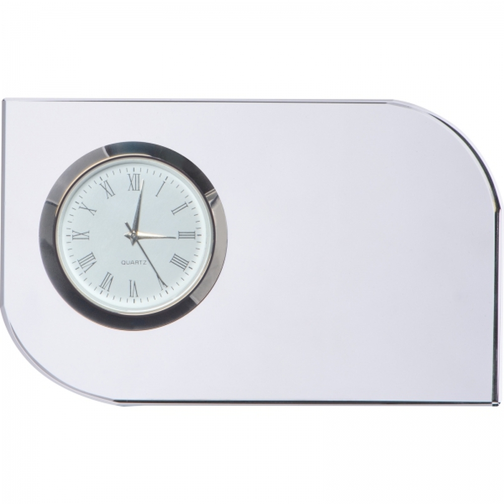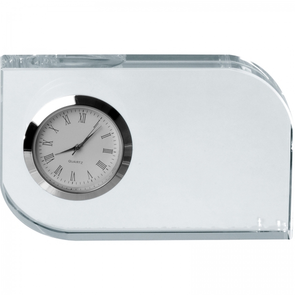 Szklany blok na biurko z zegarem. Metodą graweru laserowego można umieścić na nim tekst gratulacji lub życzenia. Zapakowany w ozdobne pudełko wyściełane satyną. Produkt zawiera baterie.