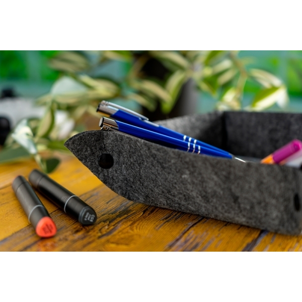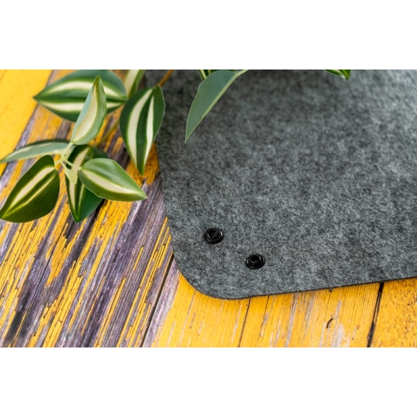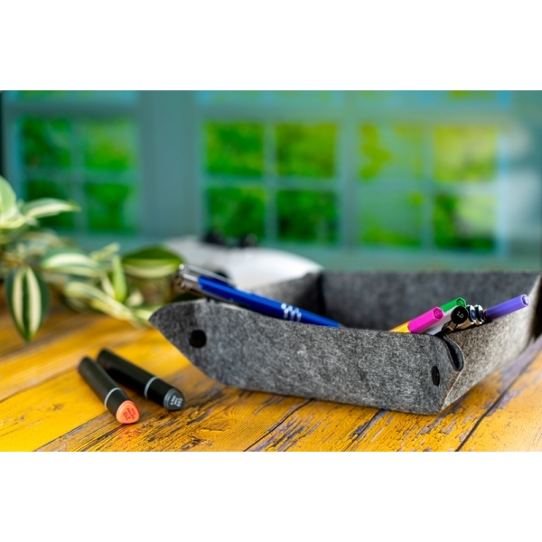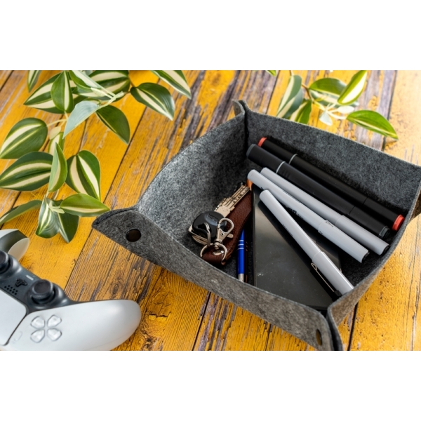 Tacka na klucze i inne drobiazgi, wykonana z filcu pochodzącego z recyklingu. Dzięki praktycznym zatrzaskom, można ją rozłożyć i przechowywać na płasko. Tacka po złożeniu ma wymiary 15 x 15 cm.
