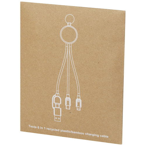 Kabel do ładowania Tecta 6 w 1 z bambusa i tworzyw sztucznych pochodzących z recyklingu to przykład połączenia zrównoważonego rozwoju ze stylem. Ten kabel RTPE o długości 25 cm zapewnia moc ładowania 2 A. Wejście: USB A i typ C. Wyjście: Typ C, micro USB i micro USB 2 w 1 oraz podwójne końcówki Lightning kompatybilne z urządzeniami z systemem iOS i Android. Aluminiowe końcówki USB zapewniają bezpieczne i stabilne połączenie, gwarantując niezawodne ładowanie za każdym razem. Srebrny brelok ze stali nierdzewnej służy do wygodnego zwijania i przenoszenia kabla. Zapakowany w kopertę z papieru Kraft.