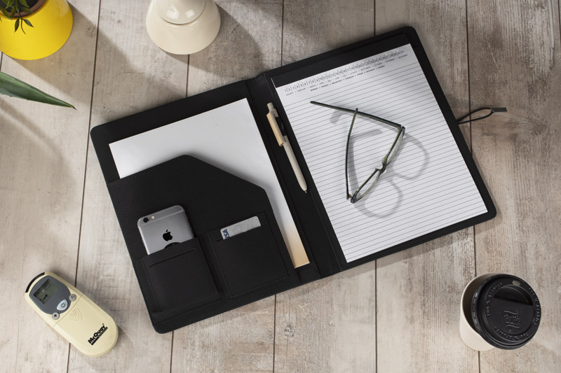 Teczka konferencyjna TELLA zamykana na gumkę zakończonąmateriałem skóropodobnym (PU) w kolorze szarym, która ułatwia otwieranie teczki i jednocześnie stanowi ciekawą i elegancka ozdobę . Zawiera jedną kieszeń do przechowywania dokumentów, dwie mniejsze kieszonki, miejsce na długopis i wizytówki oraz notes o formacie A4 z możliwością jego wymiany.