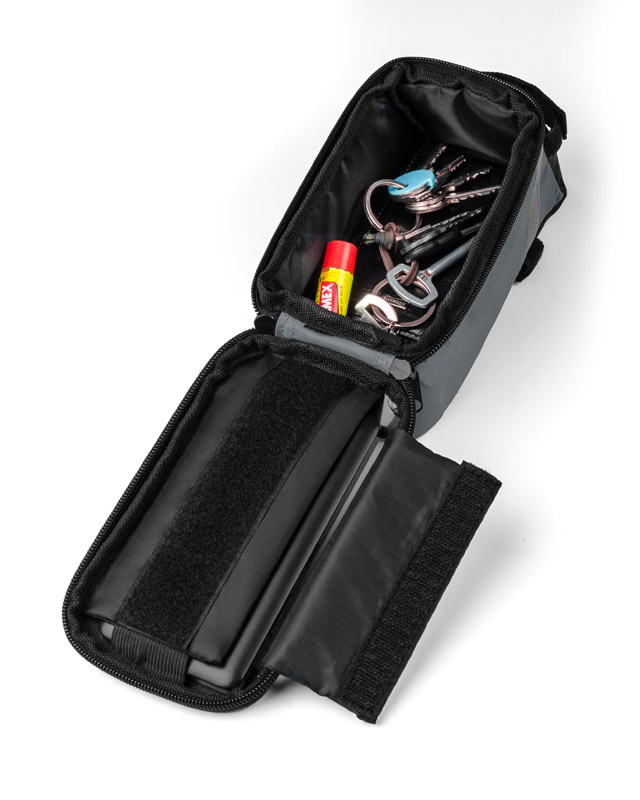Solidnie mocowana do ramy torba rowerowa posiada pojemną, zapinaną na zamek komorę na drobne przedmioty. Dodatkowo w torbie VELO znajduje się wyjście na słuchawki oraz kieszonka z folią dotykową na smartfona, która umożliwia korzystanie z telefonu bez konieczności wyciągania go z torby. Spoglądanie na nawigację czy sterowanie odtwarzaczem muzyki nie stanowi żadnego problemu, nawet podczas jazdy na rowerze.