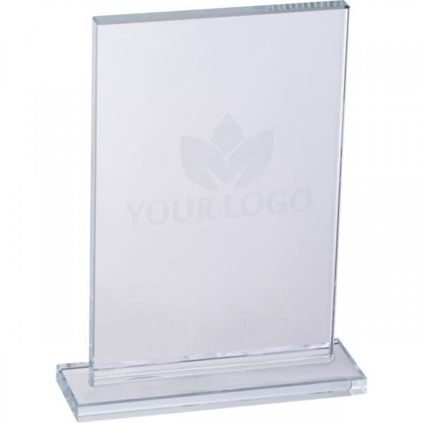 Szklane trofeum z podstawą. Trofeum jest zapakowane w pudełko prezentowe z satynową wyściółką i magnetycznym zamknięciem.