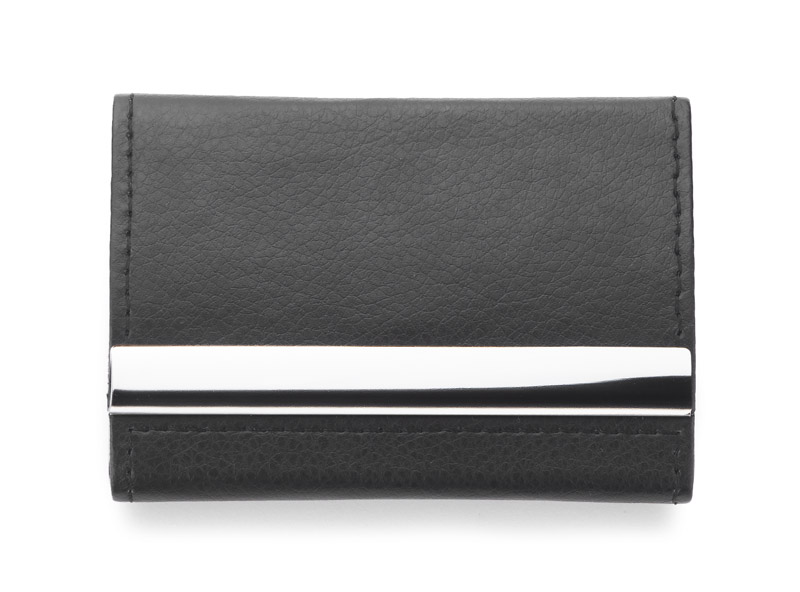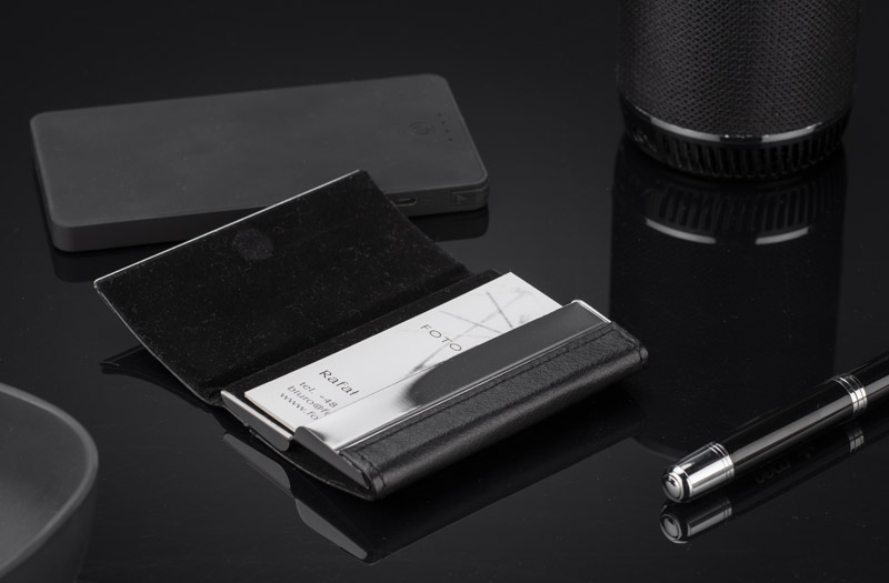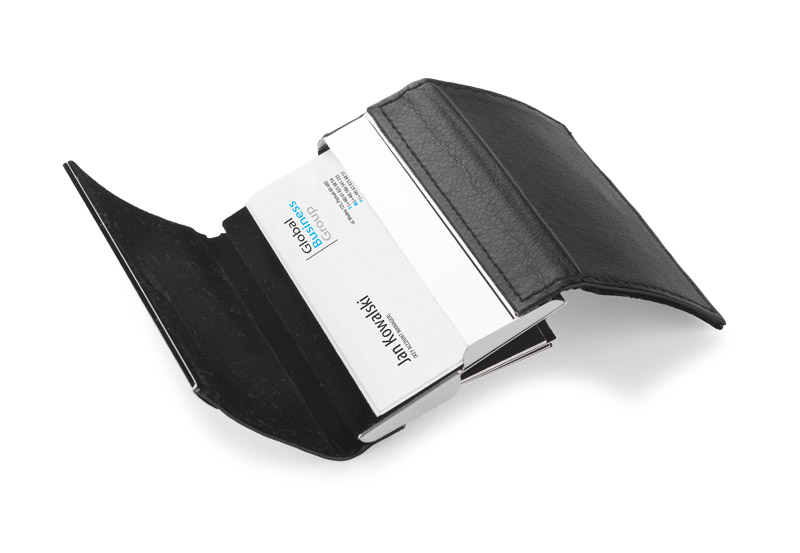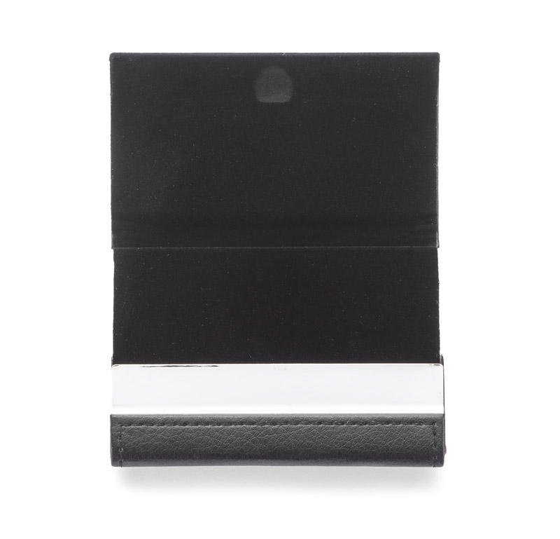 Niezwykle praktyczny wizytownik z materiału skóropodobnego (PU), dzięki któremu można przechowywać zarówno wizytówki swoje, jak i klientów. Wystarczy otworzyć właściwą przegródkę. Wizytownik pomieści 20 wizytówek (10 z kazdej strony). Grawer logo zrobimy na blaszce.