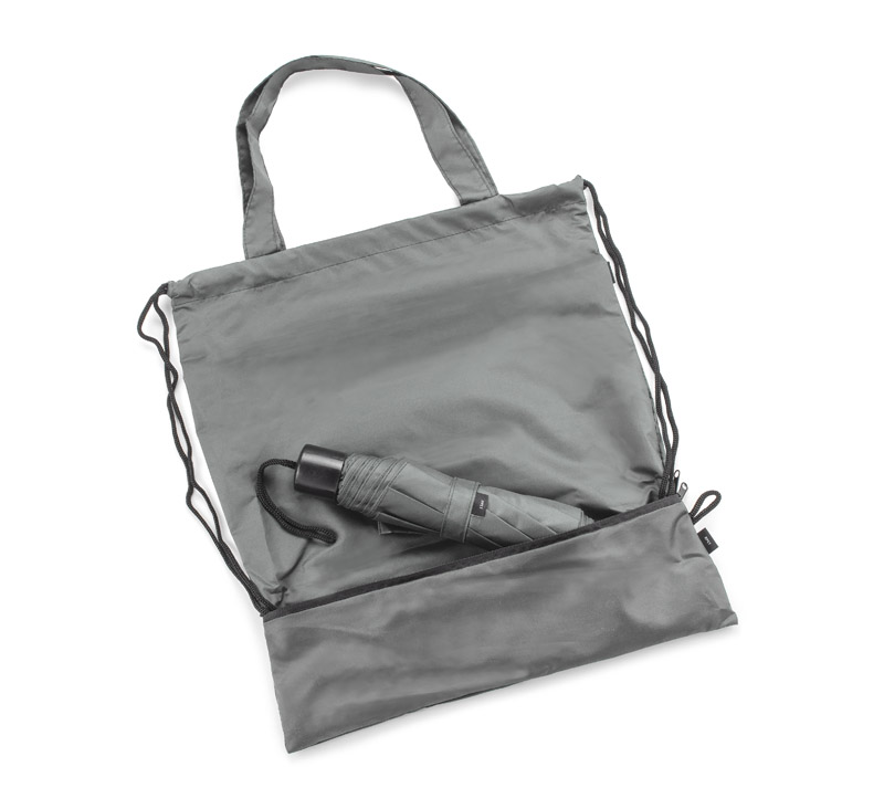 Worek na sznurkach z parasolem RAINY wykonany jest z poliestru RPET, co czyni go bardziej przyjaznym środowisku. Środek worka jest jednokomorowy. Oprócz tradycyjnych sznurków posiada jeszcze rączki o długości 44 cm, dzięki czemu może być używany także jako torba na zakupy. Na dole worka znajduje się zamykana na zamek kieszeń, w której schowany jest dołączony do zestawu parasol, także wykonany z poliestru RPET. Parasol jest otwierany i zamykany ręcznie. Maksymalny udźwig worka to około 3 kg. Wymiary produktu: worek: 370 x 410 mm, parasol: ⌀ 990 mm, dł. 550 mm (złożony: 240 x 60 x 50 mm)