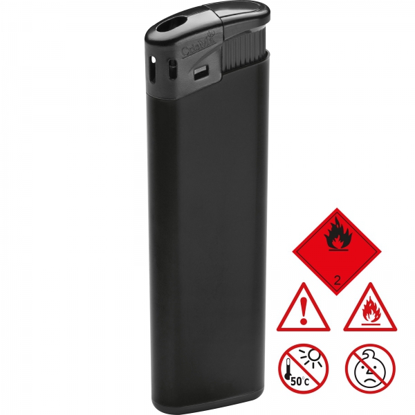 Elektroniczna, plastikowa zapalniczka z regulacją płomienia i możliwością wielokrotnego napełniania.