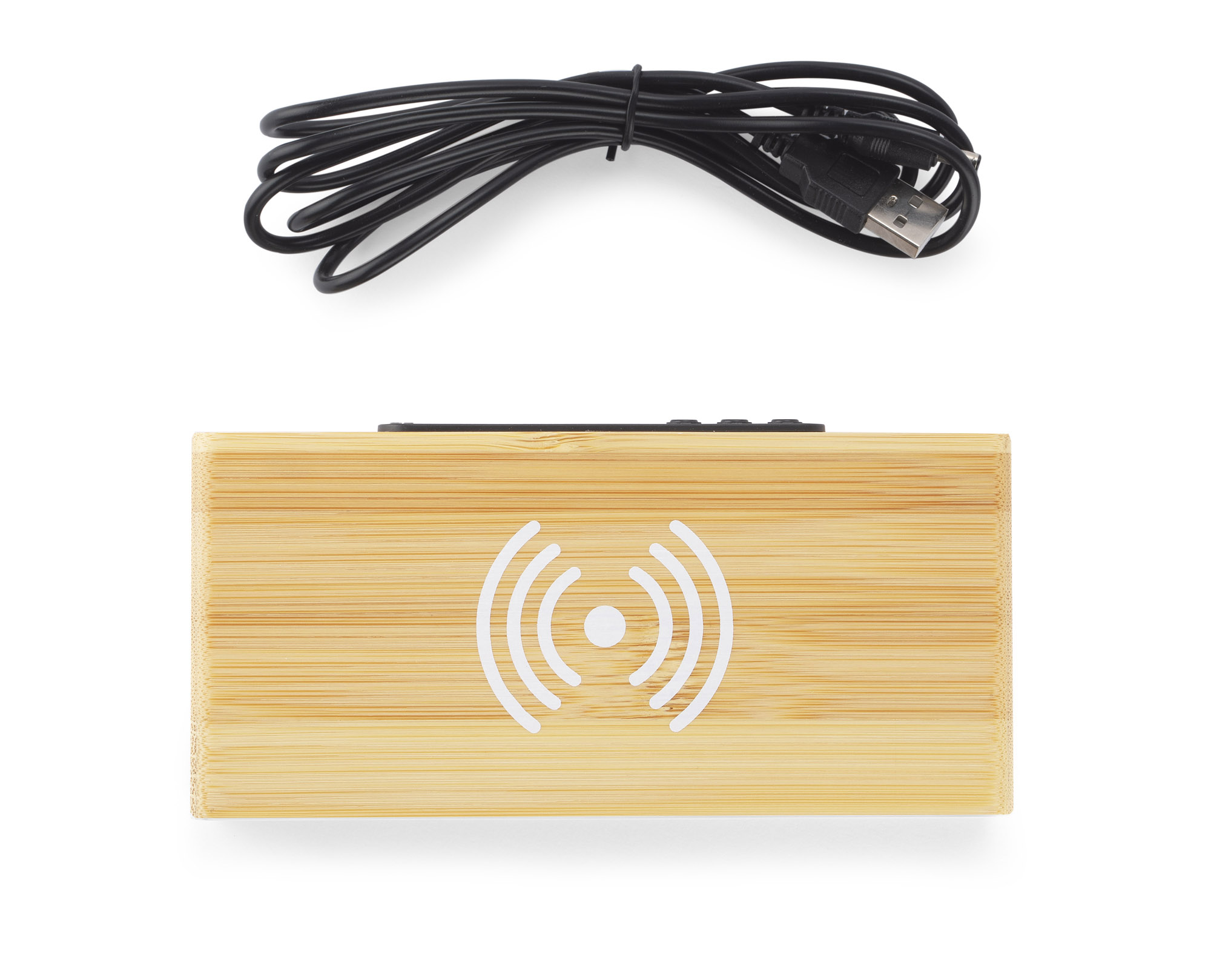 Zegar INDUCTO to połączenie cyfrowego zegara w ekologicznej bambusowej obudowie z ładowarką indukcyjną o mocy 5W. Jest to gadżet, który świetnie wygląda na biurku, a dodatkowo jest niezwykle praktyczny. W zestawie kabel do zasilania. Zegar wyposażony w funkcję kalendarza i alarmu. Dane techniczne: zasilanie - wejście DC 5V/2A, AC100-240V 50/60Hz, wyjście ładowarki bezprzewodowej: 5V/1A (maks.)